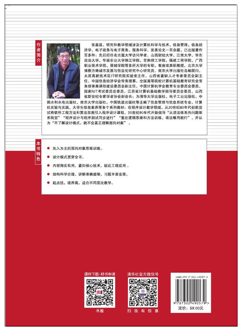 先入为主的面向对象思维训练 设计模式贯穿全书 内容详实有用,紧扣核心技术,贴近工程应用 结构科学合理,讲解准确透彻,习题丰富全面 起点低,境界高,适合不同层次教学