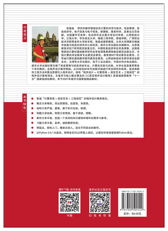 彰显“计算思维 + 语言艺术 + 工程规范”的程序设计教育理念。 概念力求精准,突出思想性、启发性、本质性。 结构力求严谨、紧凑,便于知识总结、梳理。 例题力求经典,例程力求简短,便于阅读、理解。 素材力求丰富,创造一个良好的知识建构环境和后期学习参考。 习题力求丰富、多样,减轻教师开发题目的负担。 零起点、轻松入门、螺旋式深入,适合不同层次的教学。 以Python 3.6.1为蓝本,例程多在IDLE界面上调试,以便初学者快速掌握Python语法。