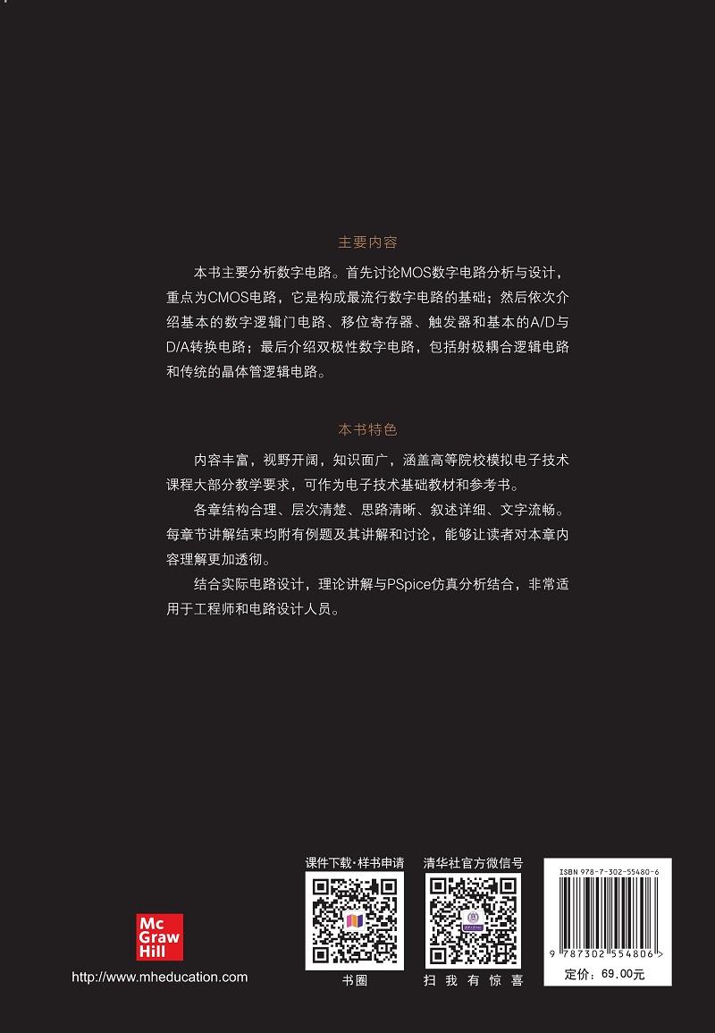本书主要分析数字电路。首先讨论MOS数字电路分析与设计,重点为CMOS电路,它是构成最流行数字电路的基础;然后依次介绍基本的数字逻辑门电路、移位寄存器、触发器和基本的A/D与D/A转换电路;最后介绍双极性数字电路,包括射极耦合逻辑电路和传统的晶体管逻辑(TTL)电路。本书理论联系实际,有利于提高读者的数字电路设计能力。