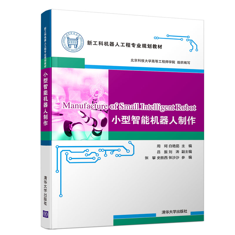 小型智能机器人制作一书不仅简述了机器人涉及的基本技术知识,还用较多篇幅介绍了机器人制作的技术流程,如基本划线、铆接、电路热转印等实践工序,使得读者能够跟随本书的教学,制作出一个小型机器人,并加以应用。此外,为了方便初学者的学习,本书还增加了在线资源、程序下载包、硬件设计套件等丰富的配套资源,方便非工科专业或大众读者进行自学。本书不仅适用于工科学生的校内实践教学,还适用于广大机器人技术爱好者的学习和制作。