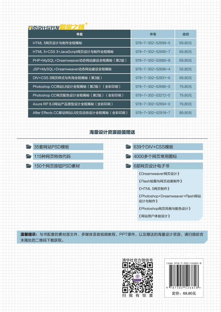 《PHP+MySQL+Dreamweaver动态网站建设全程揭秘(第2版)》以Dreamweaver CC为工具,结合Apache服务器、PHP程序语言和MySQL数据库,全面系统地讲解了使用Dreamweaver开发PHP动态网站的方法和技巧,并通过多个网站实用系统功能的开发讲解,使读者能够快速掌握这些网站实用系统功能的实现方法。 《PHP+MySQL+Dreamweaver动态网站建设全程揭秘(第2版)》内容简洁、通俗易懂,通过知识点与案例相结合的方式,让读者能够清晰明了地理解书中的相关技术内容,从而达到理想的学习效果。全书共分10章,包括配置PHP网站开发环境、PHP快速入门、MySQL数据库与phpMyAdmin管理、Dreamweaver内置服务器行为、会员管理系统、网站投票管理系统、网站新闻发布系统、网站图片管理系统、个人博客系统和商城购物车系统等内容。 《PHP+MySQL+Dreamweaver动态网站建设全程揭秘(第2版)》结构清晰、实例经典、技术实用,适合动态网页制作的初、中级读者,也可以作为高等院校动态网页制作课程的教材,还可以作为网页设计与制作爱好者的自学参考书。