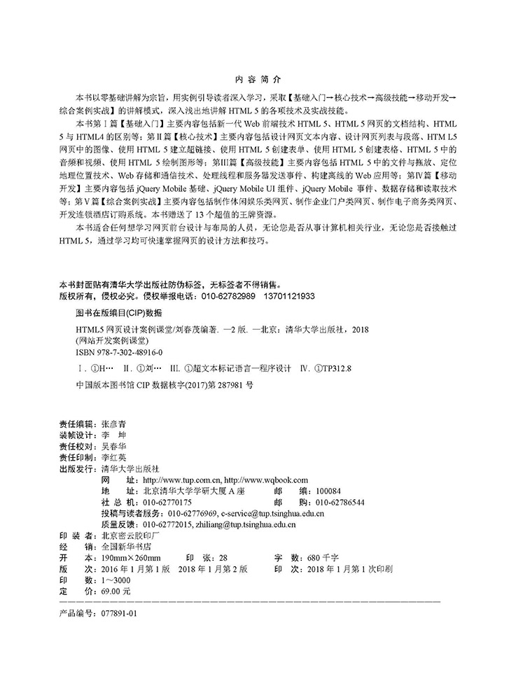 本书在编排上紧密结合深入学习网页制作技术的先后过程,从HTML 5的基本概念开始,引导读者逐步深入地学习各种应用技巧,并侧重实战技能,使用简单易懂的实际案例进行分析和操作指导,让读者读起来简明轻松,操作起来有章可循。