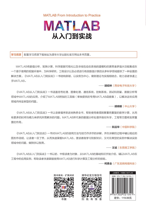 (1)资深专家编著,图书质量更有保证:MATLAB资深工程师执笔,系统总结MATLAB编程从入门到实战的方方面面。(2)提供配套源代码,便于读者动手实践:理论联系实践,提供源代码下载,方便读者学习使用。(3)内含丰富实例,利于读者二次开发:注重应用,提供近400个MATLAB典型实例,读者可以据此二次开发。(4)提供配套课件,便于教师备课使用:配套提供完整的教学课件资料,便于广大教师备课使用。