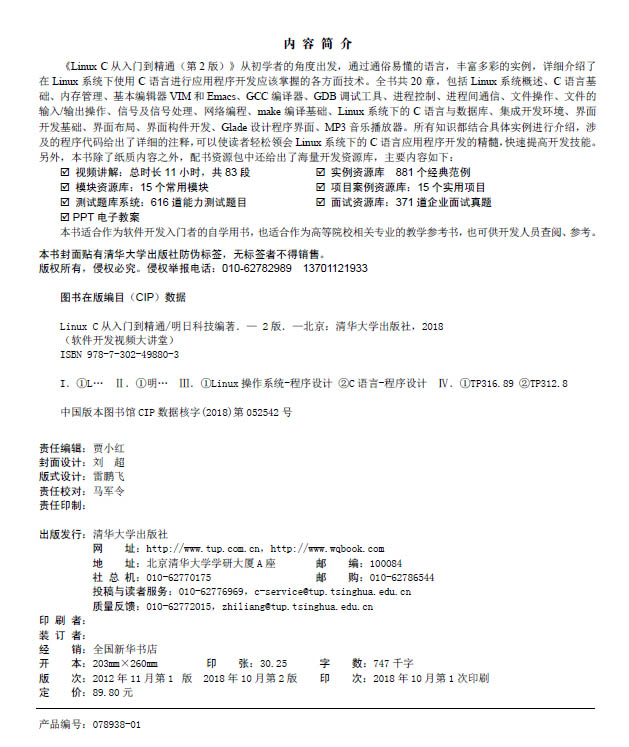 《Linux C从入门到精通(第2版)》从初学者的角度出发,通过通俗易懂的语言,丰富多彩的实例,详细介绍了在Linux系统下使用C 语言进行应用程序开发应该掌握的各方面技术。全书共20章,包括Linux系统概述、C语言基础、内存管理、基本编辑器VIM和Emacs、GCC编译器、GDB调试工具、进程控制、进程间通信、文件操作、文件的输入/输出操作、信号及信号处理、网络编程、make编译基础、Linux系统下的C 语言与数据库、集成开发环境、界面开发基础、界面布局、界面构件开发、Glade设计程序界面、MP3 音乐播放器。