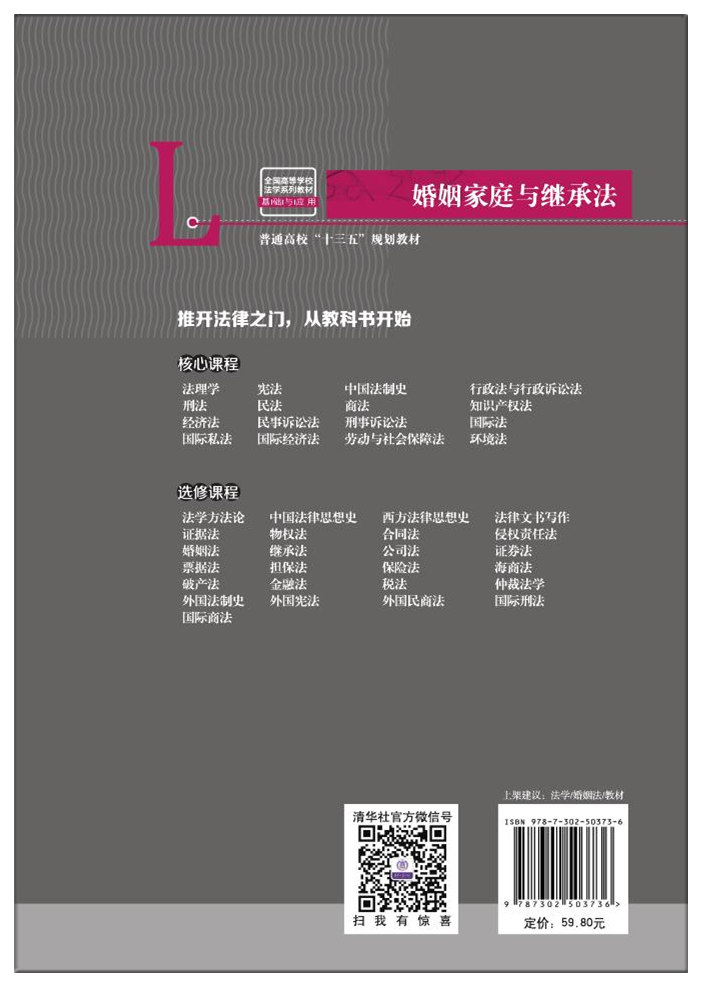 本书根据我国现行的婚姻家庭与继承法律法规及司法解释,结合司法实务,系统介绍婚姻家庭法概论,亲属,结婚法律制度,家庭关系法,离婚法律制度,与婚姻家庭法相关的法律制度,收养法,继承法,法定继承,遗嘱继承、遗赠和遗赠扶养协议,继承的开始与遗产的处理,涉外婚姻家庭与继承法律制度等婚姻家庭与继承法的基本理论知识,并注重案例教学,以培养提高学生的应用能力。 本书具有通用性和实用性,既可作为普通高等院校法学专业专业课程的首选教材,同时也兼顾高职高专、高等教育自学考试、成人教育的教学,对于广大法律工作者来说也是一本有益的在职岗位培训教材。本书封面贴有清华大学出版社防伪标签,无标签者不得销售。