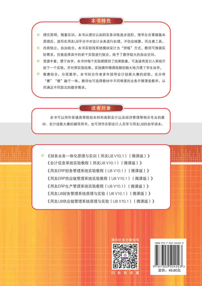 《财务业务一体化原理与实训(用友U8 V10.1)(微课版)》以简明原理、突出实训为主导思想,以一个企业单位的经济业务为原型,重点介绍了用友U8财务管理与供应链管理系统核心子系统的主要功能和业务处理方法,兼顾原理阐释与实务训练。书中为读者定做了几十个实训项目并提供了实训准备账套和结果账套,每个实验既环环相扣,又可以独立运作,适应不同层次教学的需要。 《财务业务一体化原理与实训(用友U8 V10.1)(微课版)》共分为11章,第1章介绍了会计信息化应用的基础,第2和第3章介绍了用友U8 V10.1管理软件的使用基础——企业建账和基础设置;第4~10章分别介绍了用友U8软件中最重要和最基础的总账、固定资产、薪资管理、采购管理、应付款管理、销售管理、应收款管理、库存管理、存货核算、UFO报表10个模块的基本功能,并以系列实训的形式详解了10个模块的主要业务的处理;第11章以全国信息化技能竞赛题型为蓝本,模拟一个企业连续一个月的全面经济业务进行实务操作。