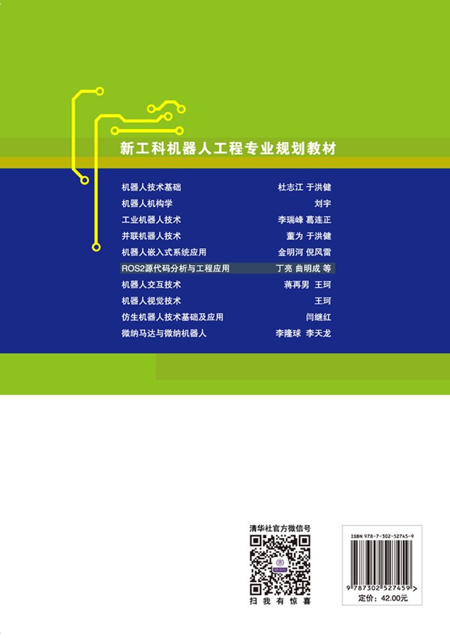 《ROS2源代码分析与工程应用》系统介绍ROS2.0结构标准、接口、通信模块,分析ROS2.0 的Ament、eProsima、ros、ros2等部分源代码, 介绍ROS2.0工具包,并 从源代码的层面讲解如何基于ROS2.0实现机械臂运动学正解、逆解,机械臂无碰撞运动学逆解,机器人状态和轨迹可视化,机械臂的驱动开发。