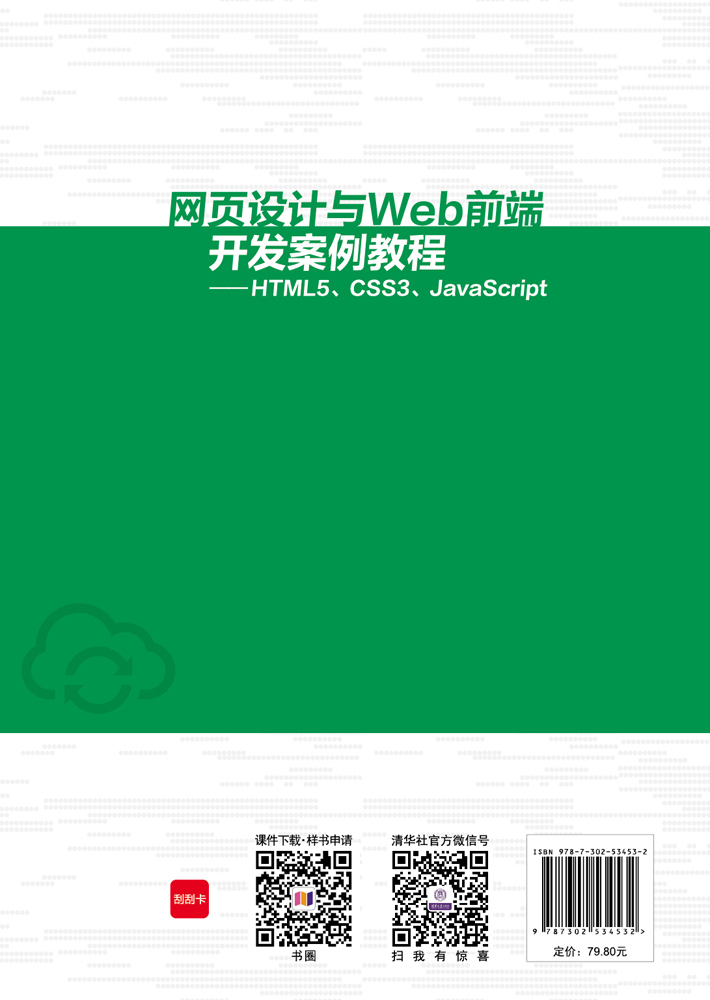 本书分为理论篇和应用篇两个部分。其中,理论篇在内容上详细剖析了最新Web标准的三大部分——HTML5、CSS3、JavaScript,及其在网页设计与Web前端开发中的应用; 应用篇则从实用的角度补充了综合实训指导及课业拓展知识等。本书知识结构体系较新,较全面地覆盖了目前企业前端工程师所需的相关理论和应用技能,同时案例形式丰富,既有针对单一知识点的小实例及贯穿特定案例网站的开发实录,也有针对Web前端技术重点和难点的案例实践,更有阶段性的综合案例实战。在案例设计方面,既突出新知识点的应用技巧,又以不同的方式巩固学过的技能,使读者能够一步一个脚印、循序渐进地扎实掌握网页设计与Web前端开发的各项技能。 本书提供了配备的课程资源包,内容包括教学大纲、制作精良的教学课件(PPT)、电子教案、重点及难点综合案例的教学视频、 本书所有的实例和综合案例的程序源码、 课后题库的参考答案等。其中,程序源码全部经过精心测试,能够在Windows 系统及以Chrome为代表的主流浏览器下编译和运行。 本书可作为普通高校计算机及相关专业教材、高职高专教材,适用于课堂教学、实验实训及综合课程设计等相关的教学活动,并可供从事网页设计与制作、Web前端开发、网页编程等行业人员参考。