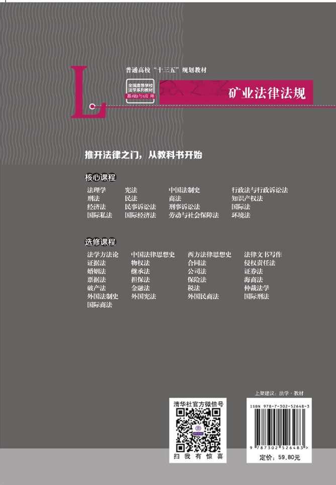 本教材根据国家矿业立法与矿业开发管理政策制度改革的最新精神,结合实际案例、具体介绍:矿业法律法规、矿业开发法律制度、矿业权出让、矿业权出租和抵押、矿业权转让、矿业权转让纠纷处理、国外矿业权规制的历程与模式、矿业生产应急管理、矿业安全生产事故调查、我国矿产资源法律责任机制的完善等知识,并通过实证案例分析讲解、提高应用能力培养。