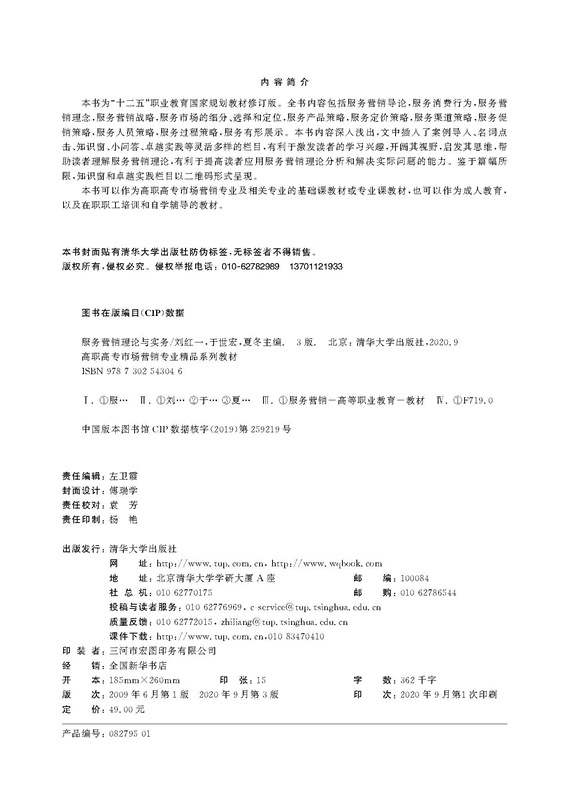 本书内容包括服务营销导论、服务消费行为、服务营销理念、服务营销战略、服务市场的细分选择和定位、服务产品策略、服务定价策略、服务渠道策略、服务促销策略、服务人员策略、服务过程策略、服务有形展示。内容深入浅出,设置了案例导入、名词点击、知识窗、小问答、卓越实践、图表等丰富多彩的栏目,有利于激发读者的学习兴趣,开拓其视野,启发其思维,有助于读者对服务营销理论的理解和应用。