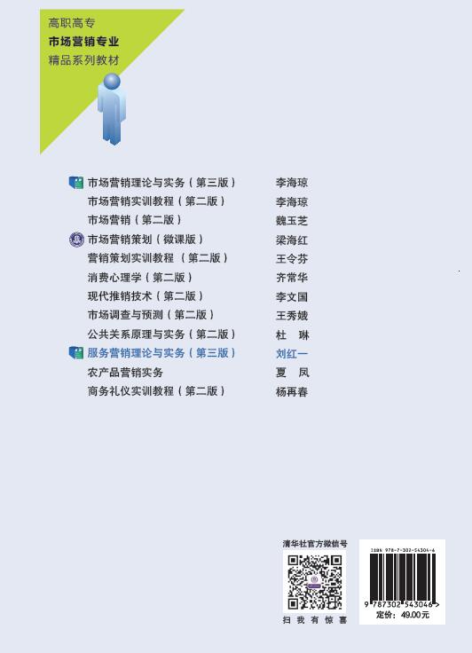 主编刘红一,经济学硕士,营销师,市场营销专业教授,1968年10月工作,在农业企业工作11年,在学校工作34年,曾任辽宁经济职业技术学院工商管理系市场营销教研室主任,工商管理系专业开发与产学研研究所所长和中国管理科学研究院特约研究员,先后在校内外讲授过服务营销等30多门课程,发表省级以上论文30多篇,完成国家级研究报告1部,省级研究报告3部,院级研究报告1部,企业调研报告9部,参加教材编写9本,其中主编教材3本并获奖,是《服务营销》院级精品课程建设工作的主要筹划者和成员,开发企业实训基地十几个,获得过学院有突出贡献者、优秀课堂、优秀教学奖教师、先进工作者等荣誉称号,阅历和教学经验丰富,科研能力强,业绩突出。 以刘红一为主编的教材编写团队是由4名多所高等学校的优秀教师组成的优秀团队,为国家规划教材的编写提供了良好的人员保障。