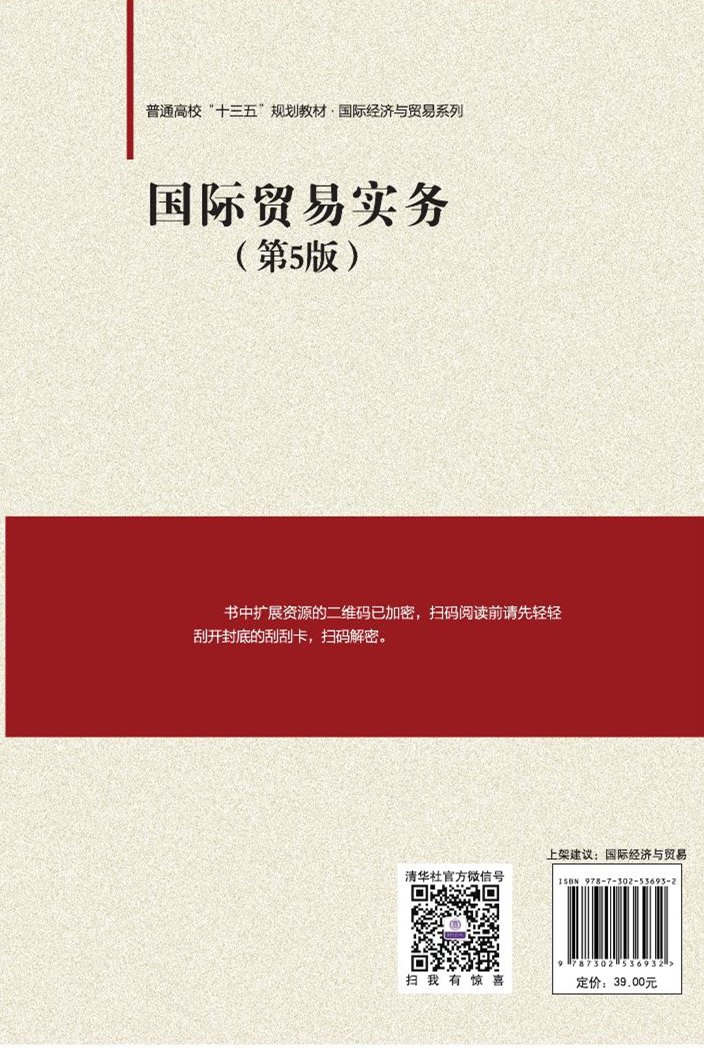 第5版前言 本书出版以后,被多所高校作为经济类、管理类专业的专业课教材,深受用户及读者的欢迎。为了不辜负读者的厚爱,应出版社的要求,于2006年1月由清华大学出版社出版第1版,2008年7月出版第2版,2012年2月出版了第3版。2015年8月出版了第4版。在以上几版基础上,又进行了修订,准备推出第5版。力求把反映最新成果、符合时代要求的国际贸易教材献给读者。 这次修订在框架结构保持不变的基础上,做了以下修订。一是新添加了内容。第二章第四节国际货物的包装第三个问题增加了二维码,第五章国际货物运输增加附录海运提单。二是重新改写了部分内容。第五章国际货物运输第二节中的大陆桥运输做了重写,第八章国际货物贸易的检验与检疫第二节第二个问题我国的商品检验机构做了重写。第十三章第七节国际电子商务做了重写,更新为跨境电子商务。第七章第三节信用证第一个问题信用证的内容做了重写。三是数据作了更新。四是对错字、遗漏做了修订。五是增加习题的题型,如单项选择题、多项选择题、计算题等。总之,这次修改会更方便教师与学生使用。 “国际贸易实务”课程不仅是国际经济与贸易专业的一门核心课,也是经济类、管理类的一门主干课。目前国际贸易实务教材版本多样、各有侧重与特色,但缺乏一本融基本知识学习和实务技能拓展为一体,既可以满足国际贸易专业学生深入研究,又可以适合其他相关专业学生全面、快速了解国际贸易业务的教材。本书以解决传统人才培养层次单一化与社会需求多样化的矛盾,适应高等教育的人才培养与教学模式的变化,培养高素质的应用型人才为主要目标。为此,本书的指导思想是体现教育思想和教育观念的转变,依据教学内容、教学方法和...