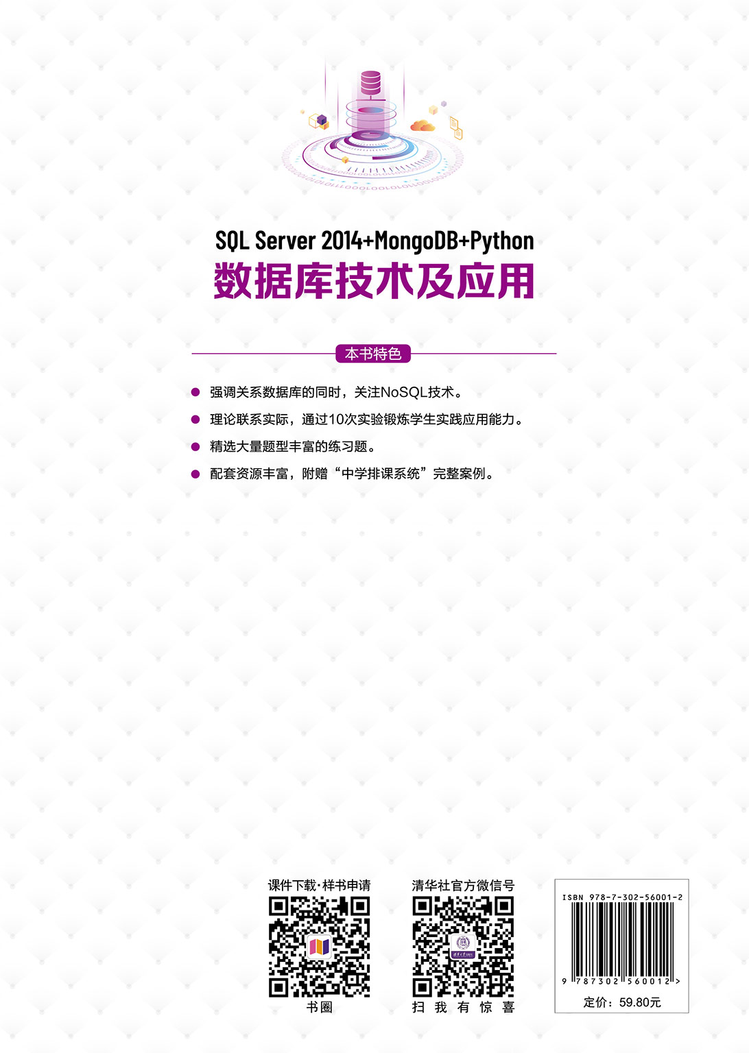 本书全面系统地阐述了数据库系统的基本概念、基本原理、基本方法和基本技术。内容包括: 数据库技术的基本概念、数据模型、关系数据库、结构查询语言(SQL)、完整性约束的实现、索引与视图、数据库安全技术、存储过程、触发器、并发控制、数据库恢复技术、关系数据库设计理论、NoSQL数据库技术和实验指导等。 本书关注新技术,注重实践应用。在有关章节穿插介绍了SQL Server 2014中的索引、视图、安全性和事务管理,并用单独一章以MongoDB为例介绍NoSQL数据库的技术特点,最后配有与教学同步的实验指导。另外,本书还介绍了Python数据库开发技术,并以“学校管理信息系统”为例展示了数据库设计的全过程。所配的练习题不但量多而且题型丰富,并赠送用SQL Server 2014和Python 3.6开发的针对中学的“排课系统”案例。所有这些都有利于读者对数据库系统基本概念、基本方法和基本技术的理解、消化、掌握和应用。 本书结构合理、概念清晰、图文并茂、例题丰富,关注新概念和新技术,适合作为高等学校计算机、软件工程、数据科学与大数据技术、大数据管理与应用、人工智能、物联网工程、电子商务等相关专业本科生数据库课程的教材,也可作为电器类专业研究生数据库课程的教材,还可作为计算机等级考试(三级数据库技术)的参考书和自学读物。