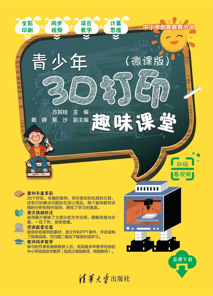 前言 亲爱的小读者,请允许我暂时这么称呼你。 在你看这本书之前,我想问问你,你是不是有时会在面包房看蛋糕师做蛋糕?你是不是喜欢看别人给自行车补胎?家里安装新家具或新家电的时候,你是不是也喜欢一直在旁边看着?你是不是对自动铅笔里的结构感到很好奇?如果你有这些经验的话,我猜你一定非常喜欢研究事物的制作过程,也很喜欢探索物品的内部结构。那么恭喜你,在你拿起这本书的时候,你做了一个很棒的选择。 一、什么是3D打印 其实3D打印就是高科技版的捏橡皮泥,你想要的都能帮助你打印出来,只不过不同的材质使3D打印的物品更为精细和实用,当然它还有更加有趣的功能,你可以在第1单元里找一找这个问题的答案。 二、3D打印可以做什么 如果3D打印可以让你吃到一支鳄鱼样子的冰淇淋,你会不会觉得很神奇?3D打印就是这样,利用不同的打印材质,可以打印出物品的实体,从吃的到用的,从穿的到住的,甚至汽车里也有3D打印出来的零件。也许它可以给你打印一颗牙齿,也许它能帮你打印一座房屋……这就是3D打印的奇妙之处。 三、没有3D打印机怎么学 《青少年3D打印趣味课堂(微课版)》主要和你一起学习3D设计,就像一个建筑设计师,也不一定要亲自去把房子造出来,而是在计算机或者图纸上画出自己的设计效果。所以,即便你没有3D打印机,你也可以先在计算机上下载、安装一个3D软件,然后再在其中设计出你创造的各种物品,从而成为一名很棒的3D设计师。 四、《青少年3D打印趣味课堂(微课版)》特色和结构 《青少年3D打印趣味课堂(微课版)》的编写者常年从事一线教学工作,因此他们非常了解你的兴趣所在。所以书中会让你在3D软件中...
