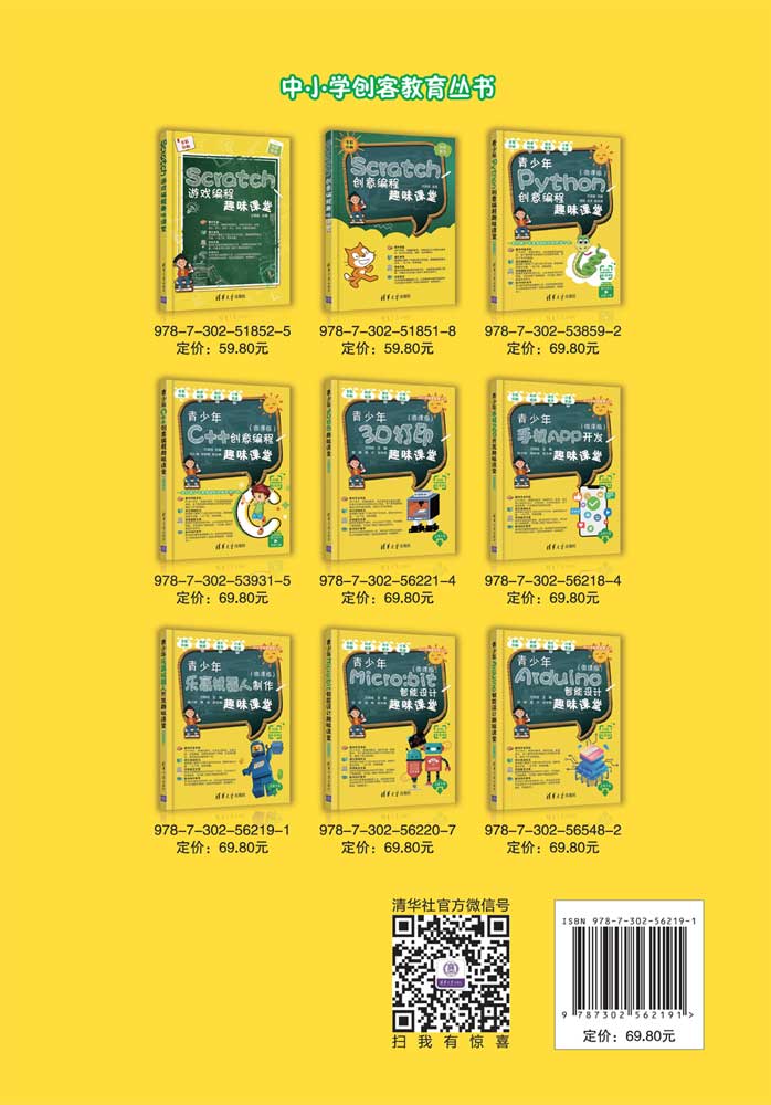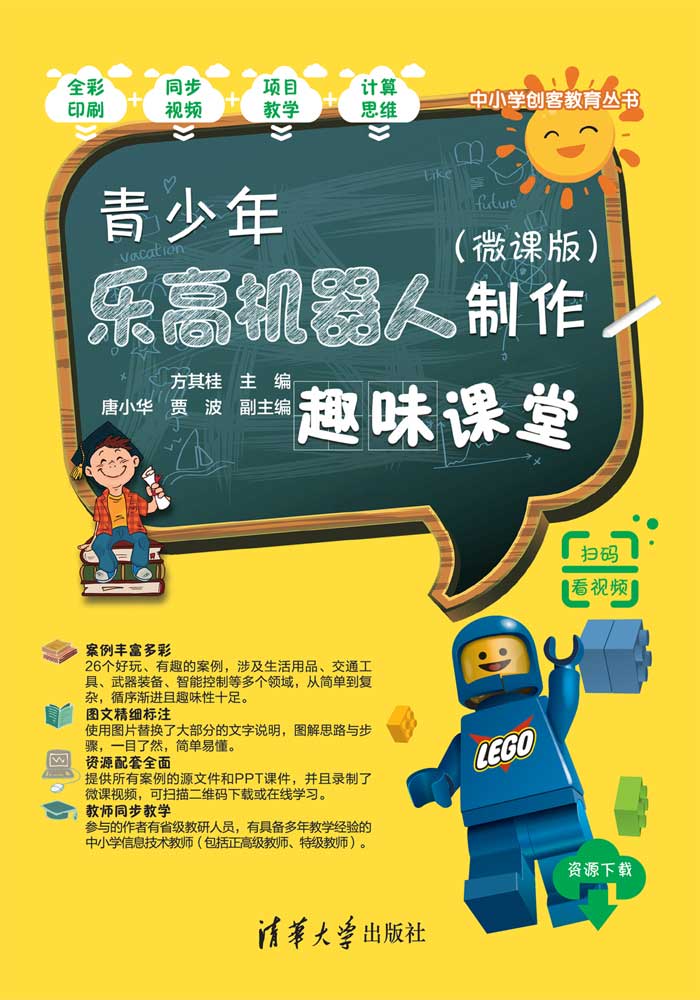 《青少年乐高机器人制作趣味课堂(微课版)》分7个单元,共26个案例,由浅入深地向读者展现了利用乐高9686科学与技术套装、EV3套装设计和制作机器人的完整流程。全书以单元和课的形式编排,围绕机器人的组成、结构、能源、传动、齿轮、智能和设计展开。案例涉及生活用品、交通工具、武器装备、智能控制等多个领域,从简单到复杂,循序渐进,典型而富有趣味。每个案例通过作品构思,帮助学生在作品与实际生活建立联系的基础上产生疑问,通过作品规划形成作品方案。在分析和实现的过程中层层推进,解决疑问,带领学生将一个有创意的想法通过分析、规划,形成方案,最后编写程序完成作品,使学生体验成功的乐趣。学习过程中注重培养学生对事物本质特征的认知,引导学生通过观察、测量、记录等活动探究各种原理,注重学生观察能力、探究意识、空间逻辑思维等创新意识和能力的培养。 《青少年乐高机器人制作趣味课堂(微课版)》适合中小学生阅读使用,可以作为教材辅助校外机构及学校社团开展机器人教学活动,也可作为广大中小学教师和培训学校开展机器人教育的指导用书。