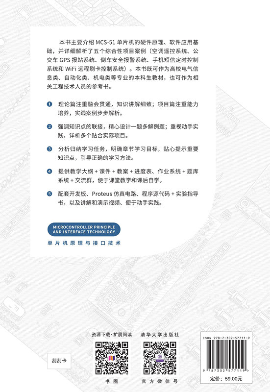 本书理论篇以MCS-51单片机为基础,项目篇采用增强型51单片机。在理论篇,全面详尽地介绍单片机硬件结构、C51编程基础、中断系统、定时器/计数器、串行通信知识,补充了应用场合较多的A/D转换器与PWM知识和系统总线扩展知识。在项目篇,以目前市场上流行的物联网、家电控制、超声波倒车报警等技术为基础,应用数码管、OLED、矩阵键盘、MP3播放、WiFi通信、短信收发控制、红外线遥控、触摸屏等技术形成5个综合项目,讲解硬件原理、教学和学习方法以及编程主要思路。 本书可作为高等院校“单片机原理”“单片机原理与接口技术”等相关课程的教材,也可供相关工程技术人员、技术爱好者参考使用。