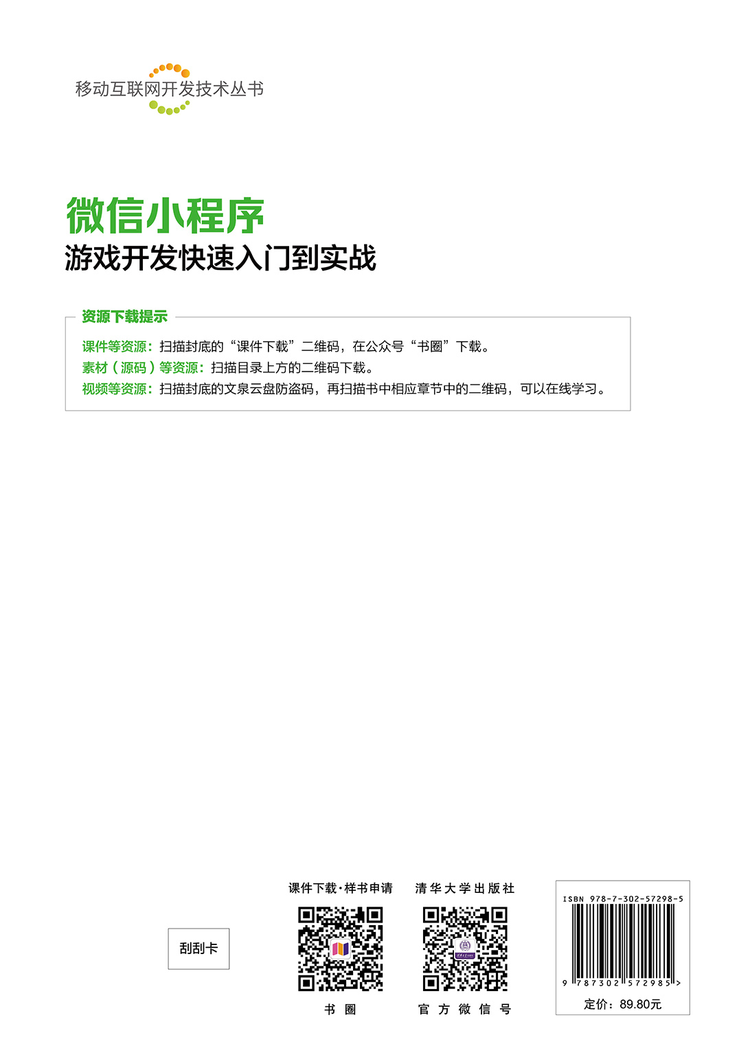 本书是微信小程序游戏开发的入门教程,通过大量案例介绍微信小程序游戏开发的基础知识和技巧。全书 分三篇,基础篇(第1~3 章)对微信小程序的框架文件、微信小程序的逻辑层和视图层、微信小程序的组件进 行详细介绍,包括JavaScript 编程语言基础、WXML 、WXSS 和组件的使用,尤其重点学习与游戏绘图相关的 Canvas 画布组件。开发篇(第4~17 章)应用前面的知识设计了14 个大家耳熟能详的游戏案例,例如贪吃蛇游 戏、推箱子游戏、智力测试游戏、五子棋游戏、黑白棋游戏、拼图游戏和Flappy Bird 游戏等,进一步提高对知 识的应用能力。提高篇(第18~22 章)讲解如何使用当前流行的游戏开发工具Cocos Creator 开发微信小游戏, 并实现两个游戏案例:跳跳猫和俄罗斯方块。 本书的**特色是通过具体案例讲解游戏开发,将关键技术分解到各个案例,不仅有利于知识点的掌握, 更重要的是让读者学会如何开发游戏。书中对源代码进行了非常详细的解释,做到通俗易懂,图文并茂。 本书可作为高等学校计算机、数字媒体技术等相关专业的教材,也适用于游戏编程爱好者和微信小程序编 程学习者。