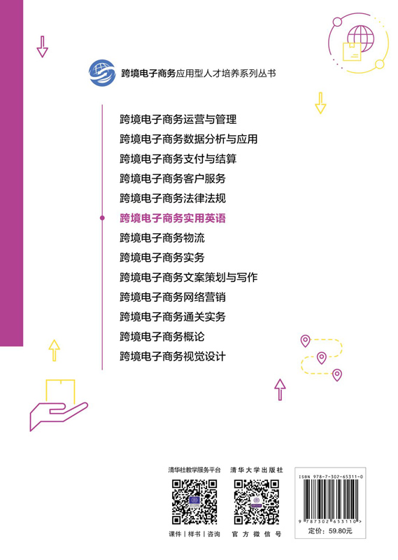 《跨境电子商务实用英语》共八章,包括跨境电子商务概述,跨境电子商务平台,建立商务关系,跨境电子商务支付与结算,跨境电子商务物流,跨境电子商务市场理论,跨境电子商务订单管理,跨境电子商务服务。 《跨境电子商务实用英语》内容全面、实例丰富,既适合普通高等院校跨境电子商务、电子商务、物流管理、国际经济与贸易、市场营销等专业作为教材使用,也适合跨境电子商务创业者、从业者和培训机构参考使用。