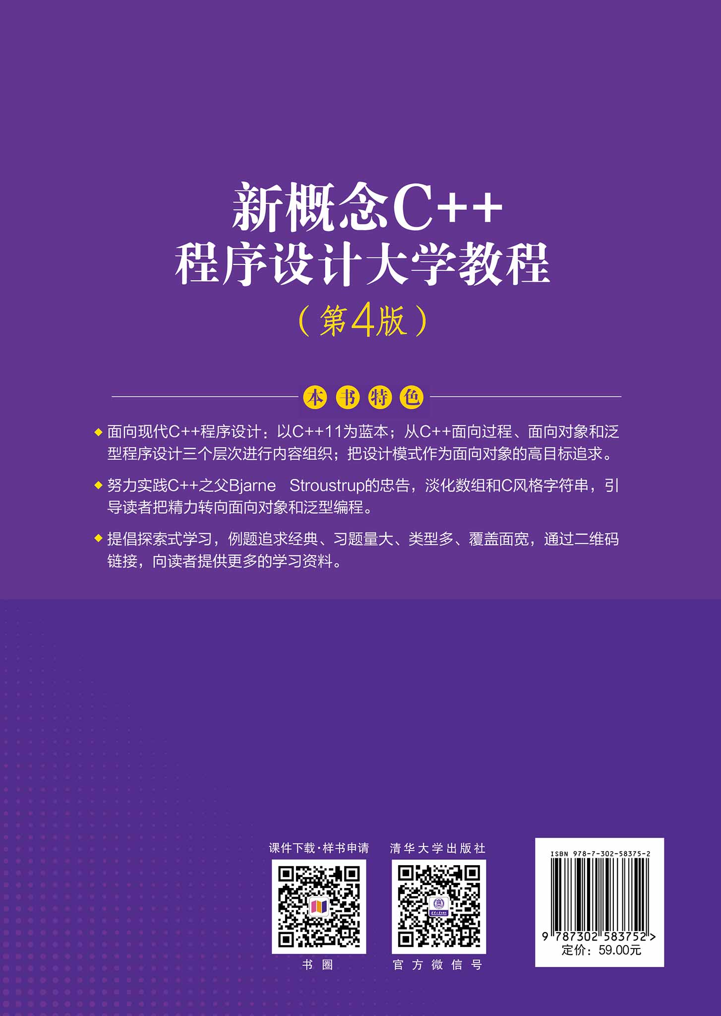 本书以C++命令式编程为基础,深入介绍C++面向对象编程的有关机制,并将应用落实到泛型编程上,力求充分彰显C++多范型的特色。全书将9章内容分为3篇。 第1篇:C++命令式编程。用4章内容帮助初学者建立命令式编程的基本原理和方法。 第2篇:C++面向对象编程。用3章内容介绍C++的类、继承和多态,并引入设计模式的思想,进一步提升读者“程序设计 = 计算思维 + 语言艺术”的观念。 第3篇:C++泛型程序设计。用2章分别介绍模板和STL。 本书结构清晰,以彰显C++多范型程序设计的特色;概念精确,可引导读者透过现象看本质,准确把握C++语法;例题经典、习题丰富,书中有多个二维码形式的知识链接,为读者提供了操作训练、扩展视野的学习环境。书中还介绍了C++11的重要新特性。 本书适合作为高等院校各专业面向对象程序设计的教材,也可供培训机构使用,以及相关领域人员自学。
