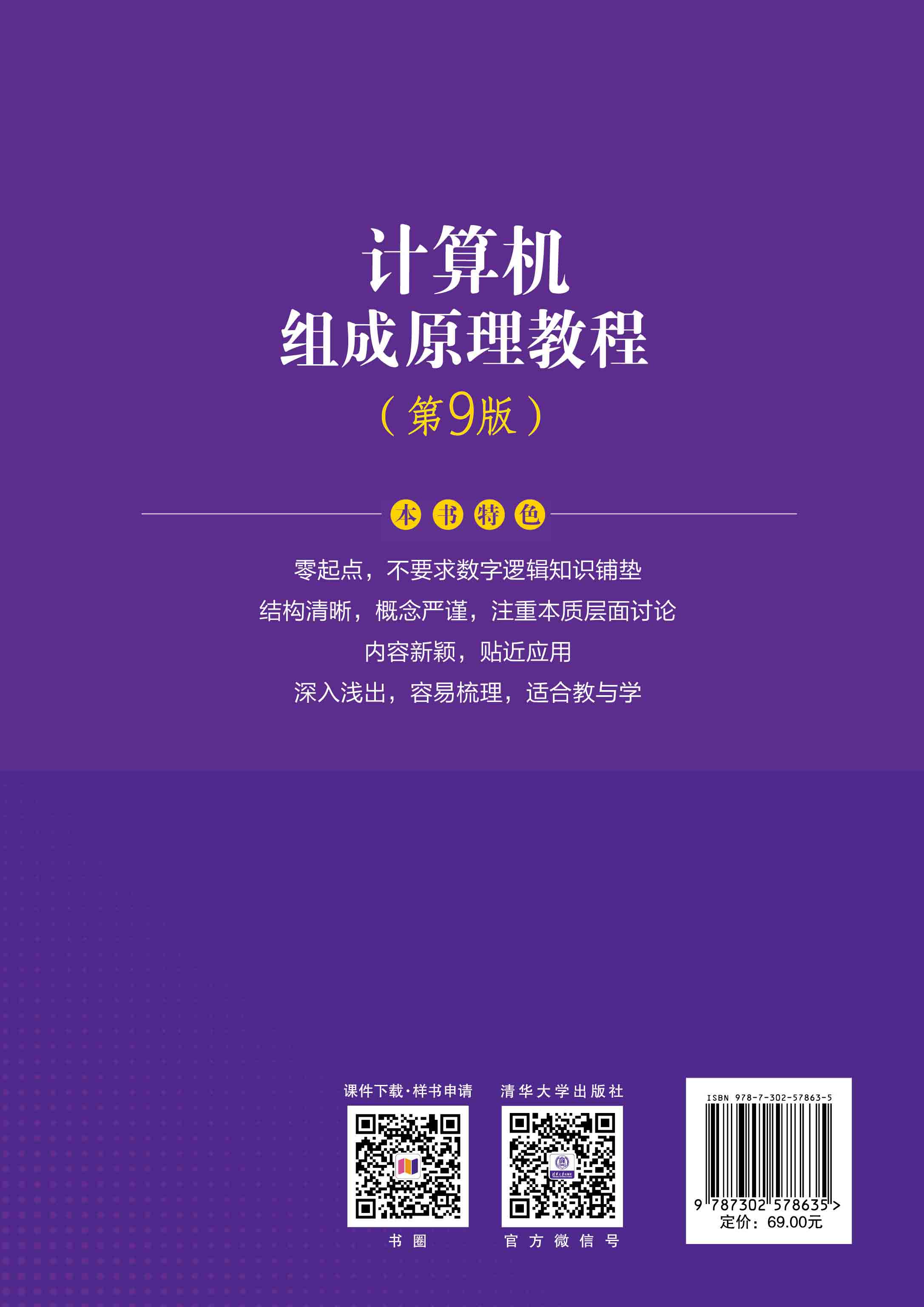 本书是一本面向应用的计算机组成原理教程。全书共 8 章:第 1 章趣味并深刻地引导读者建立计算机 系统的整体框架;第 2 章介绍计算机的存储系统;第 3 章介绍计算机输入输出设备;第 4 章介绍 I/O 接口 与 I/O 过程控制;第 5 章介绍总线与主板;第 6 章介绍计算机核心部件——控制器的工作原理和基本设计 方法;第 7 章在架构层面介绍处理器中的并行技术;第 8 章从体系结构和元器件两方面介绍计算机的发展 趋势。 本书结构清晰、概念严谨、取材新颖、深入浅出,从知识构建、启发思维和适合教学的角度组织学习 内容,同时不过多依赖先修课程。经过 8 次修订,更加适合教学,可供应用型本科计算机科学与技术专业、 软件工程专业、信息安全专业、网络工程专业、信息管理和信息系统专业和其他相关专业使用,也可供有 关工程技术人员和自学者参考。