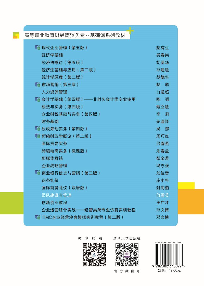 本书按项目化教学编排,从认识团队及角色开始,依次安排管理团队所需的几大技能,主要内容包括团队认知与建设、团队愿景、团队执行力、团队沟通与协调、团队领导力、团队激励、团队绩效,最后安排了团队创新项目,以进一步提升团队建设能力。本书以知识点、技能点为颗粒度进行微课建设,并配套教学课件、习题、实训项目、案例等数字化教学资源。本书通过典型案例分析、角色扮演、岗位实战等体验式学习,帮助学生快速理解和掌握相关团队技能,适合作为高职高专院校学生教材使用。