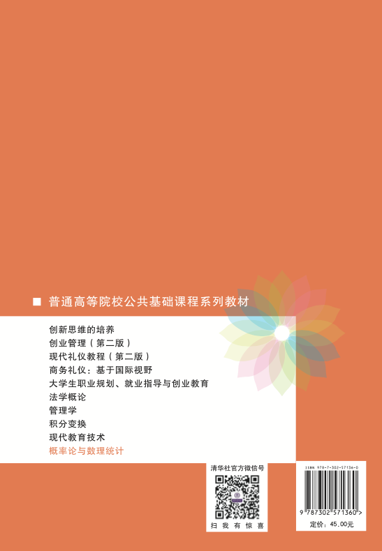 本书根据高等学校工科数学课程教学指导委员会拟定的《概率论与数理统计课程教学基本要求》和《全国硕士研究生入学统一考试数学考试大纲》编写而成。本书以培养学生运用概率论与数理统计的思想和方法解决随机问题的能力为出发点,科学系统地介绍了概率论与数理统计的基本概念、原理和方法。本书内容分为10章: 第1章至第5章为概率论,包括随机事件及其概率、随机变量及其分布、二维随机变量及其分布、随机变量的数字特征、大数定律和中心极限定理; 第6章至第9章为数理统计,包括数理统计的基本概念、参数估计、假设检验、方差分析及回归分析; 第10章为Excel在数理统计中的应用。 本书理论叙述严谨、语言精练、概念明确、应用性强,书中适当增加了概率论与数理统计的应用实例,同时配备了综合训练题,作为学生复习提高之用。 本书可以作为工科大学本科各专业的教材,可以供财经类、理工类专业选用,也可以作为报考硕士研究生人员及工程技术人员的学习参考用书。 本书封面贴有清华大学出版社防伪标签,无标签者不得销售。