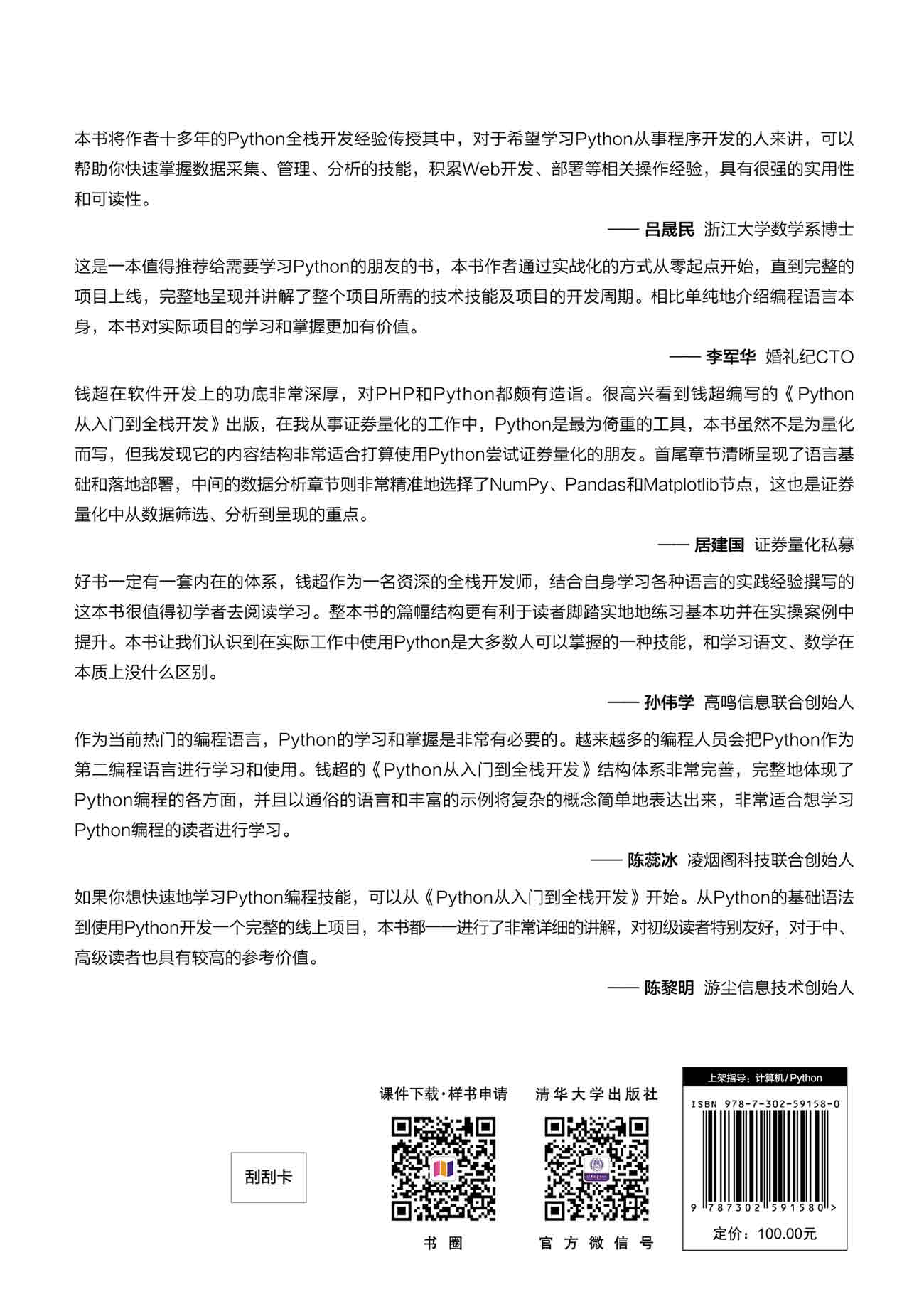 本书从实际项目出发,以Python为主要编程语言从基础知识到高级编程、从前端开发到后端开发,全面系统的阐述在Python实际项目开发过程中所需用的到各种技术及相关知识。 全书共分为3篇:第1篇为入门篇(第1和2章),入门篇详细讲解Python编程语言的基础知识,包括Python编辑器PyCharm的使用、Python的变量及标识符、数据类型、运算符、行和缩进、条件语句、循环语句、函数、面向对象编程、错误和异常、模块及常用模块的使用、包的使用、迭代器、生成器、装饰器、多进程与多线程。 第2篇为应用篇(第3章~第6章),应用篇详细讲解Python与第三方软件的结合及实际使用,包括Python对MySQL的操作、对MongoDB的操作、对Redis的操作、使用Python爬取网页内容、爬取App内容、常见数据分析与可视化包NumPy、Pands、matplotlib的使用、Python与前端交互等。 第3篇为实战篇(第7章~第8章),实战篇详细讲解Flask框架的使用,并通过开发一个短视频数据平台将前文所学的全部技术内容应用在实际项目当中,使学以致用。除了开发项目之外,对项目的上线流程也做了详细的讲解,包括服务器的部署、域名设置、服务器的备案等。使所学的知识真正能用在实际项目当中。 本书可作为Python初学者入门书籍,也可作为从事Web开发或者数据分析技术人员及培训机构的参考书籍。