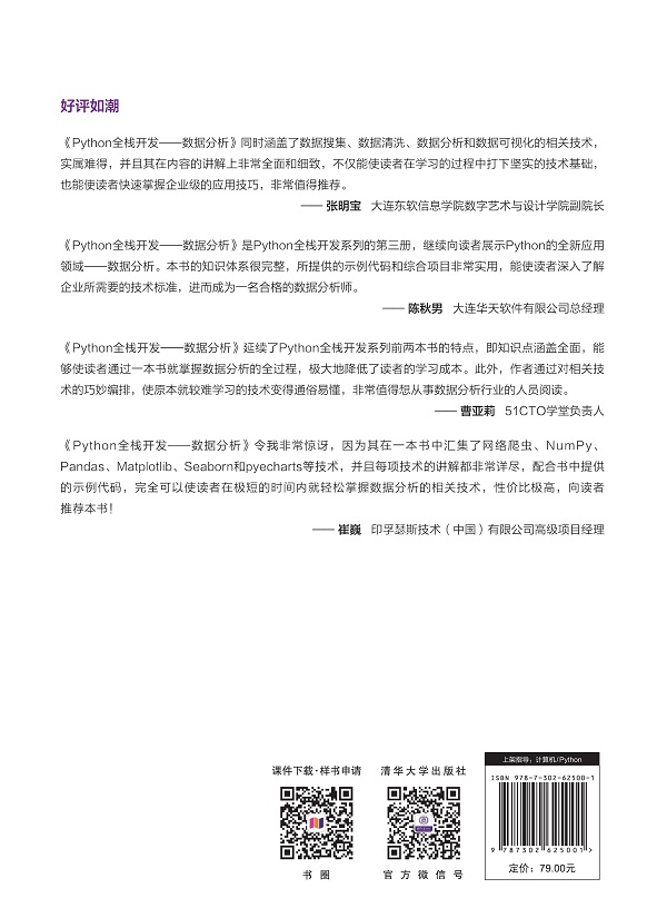 Python全栈系列包括4册书,分别为《Python全栈开发——基础入门》《Python全栈开发——高阶编程》《Python全栈开发——数据分析》和《Python全栈开发——Web编程》。 本书是Python全栈开发系列的第3册,共分为7章,将重点讲解数据分析的相关知识点,即数据搜集、数据清洗、数据分析和数据可视化,并搭配近400个示例代码,理论知识与实战开发并重,可以帮助读者快速、深入地理解和应用相关技术。 本书可以作为广大计算机软件技术人员的参考用书,也可以作为大中专,以及高等院校计算机科学与技术、自动化、软件工程、网络工程、人工智能和信息管理与信息系统等专业的教学参考用书。