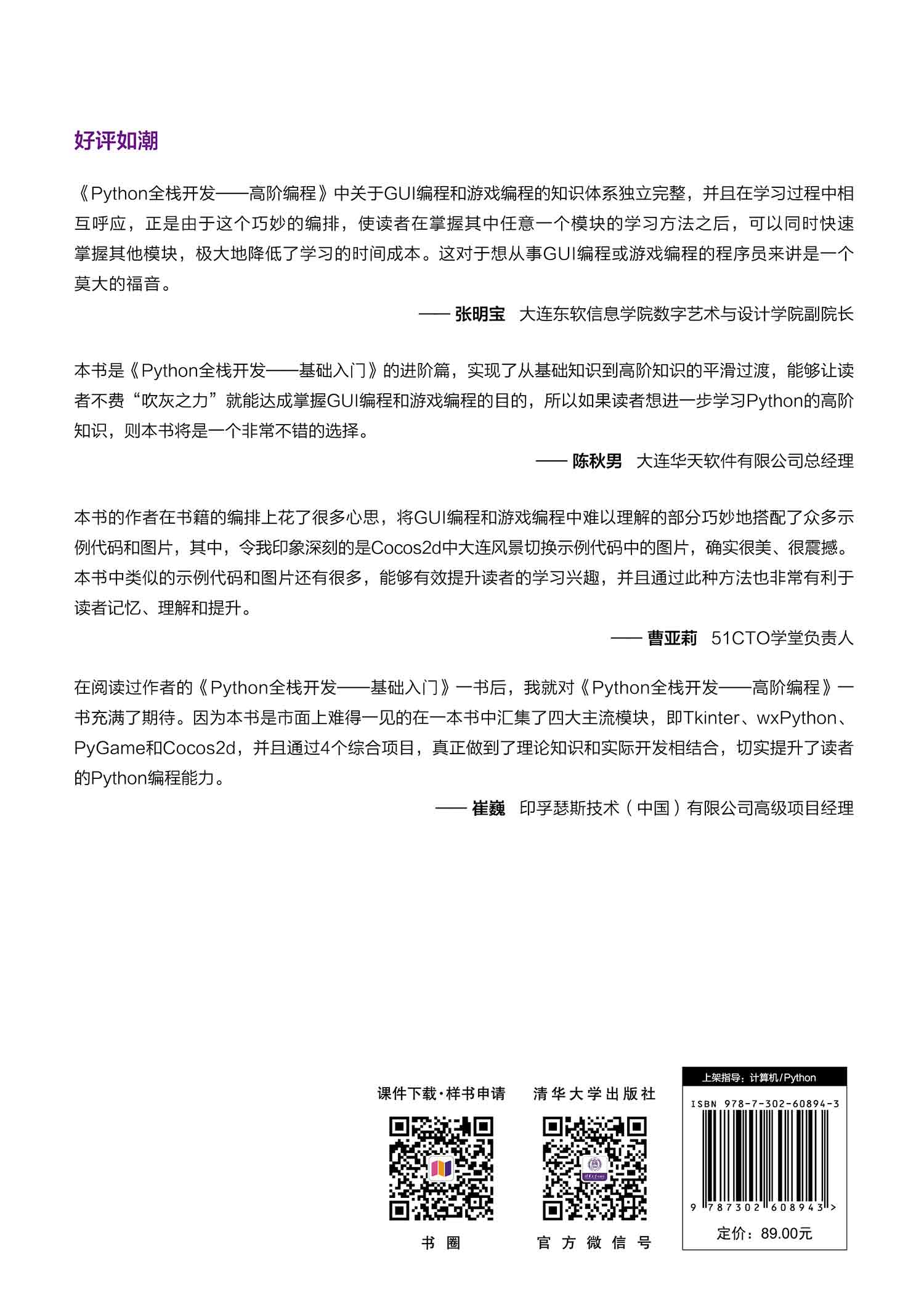 前言 随着互联网的快速崛起,众多编程语言进入了大众的视野。尤其是目前的大数据、人工智能等技术领域更是火遍大江南北,几乎每天都可以从各种新闻报道中看到它们的身影,相关工作岗位所需要的技术人才更是一度出现供不应求的现象,而Python正是实现上述技术的最佳编程语言。 Python横跨多个互联网核心技术领域,并且以其简单高效的特点,被广泛应用于各种应用场景,包括GUI开发、游戏开发、Web开发、运维自动化、科学计算、数据可视化、数据挖掘及人工智能等。 此外,随着国家对未来的人工智能等技术领域的重视和布局,更凸显出Python的重要地位。从2018年起,浙江省信息技术教材启用Python,放弃VB,这一改动也意味着Python将成为浙江省高考内容之一。更有前瞻性的是,山东省最新出版的小学信息技术教材,在六年级课本中也加入了Python的相关内容——终于,小学生也开始学习Python了! 本书正是在这样的背景之下应运而生。本书是Python全栈开发系列的第2册,全书共分为6章,重点讲解GUI编程和游戏编程的四大主流模块,即Tkinter、wxPython、PyGame和Cocos2d,并搭配200多个示例代码和4个综合项目,理论知识与实战开发并重,可以帮助读者快速、深入地理解和应用GUI编程和游戏编程的相关技术。 著名的华人经济学家张五常曾经说过,“即使世界上99%的经济学论文没有发表,世界依然会发展成现在的样子”,而互联网时代的发展同样具有其必然性,所以要想成功,我们就必须顺势而为,真正地站稳在时代的风口之上。 勘误 在本书的编写过程中,笔者始终本...