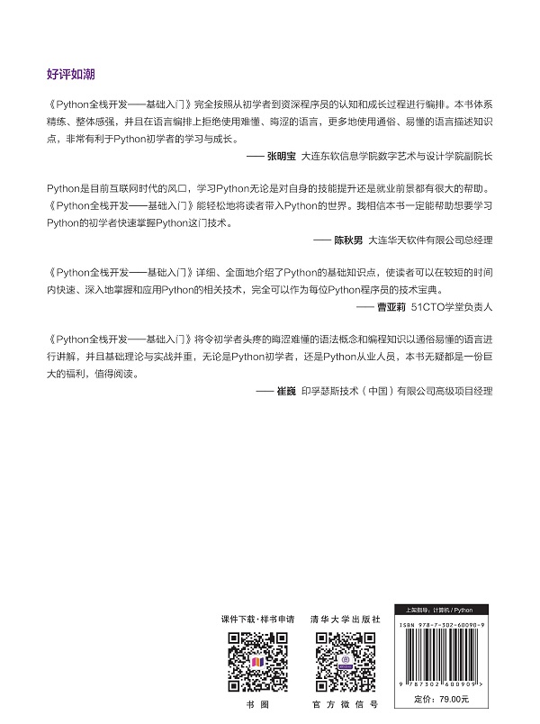 前言 随着互联网时代的快速崛起,众多编程语言走进了大众的视野,尤其是当下的大数据、 人工智能(AI)等技术领域更是火遍大江南北,几乎每天都可以从各种新闻报道中看到它们的身影,相关工作岗位所需要的技术人才更是一度出现供不应求的现象,而Python正是迈进上述技术领域需要掌握的最佳编程语言之一。 Python横跨多个互联网核心技术领域,并且因其简单、高效的特点,被广泛应用于各种应用场景,包括GUI开发、游戏开发、Web开发、运维自动化、科学计算、数据可视化、数据挖掘及人工智能等。 此外,随着国家对未来的人工智能等技术领域的重视和布局,更凸显出了Python的重要地位。从2018年起,浙江省信息技术教材已启用Python,放弃Visual Basic,这一改动也意味着Python已成为浙江省高考内容之一。更有前瞻性的是,山东省最新出版的小学信息技术教材,在六年级课本中也加入了Python的相关内容。终于,小学生也开始学习Python了! 本书正是在这样的背景下应运而生。本书是Python全栈开发系列的第1册,重点讲解与Python相关的基础入门知识,搭配570个示例代码,可以帮助读者快速、深入地理解和应用相关技术,为之后的进阶学习夯实基础。 本书共19章。第1章Python简介,主要包括Python的历史、设计哲学、特点和应用场景等知识点; 第2章Python开发环境,主要包括Python解释器、Python编辑器和IDE工具的安装等知识点; 第3章基本语法,主要包括变量、常量、模块和包的定义等知识点; 第4章编码规范,主要包括命名规范、注释规范、导入...
