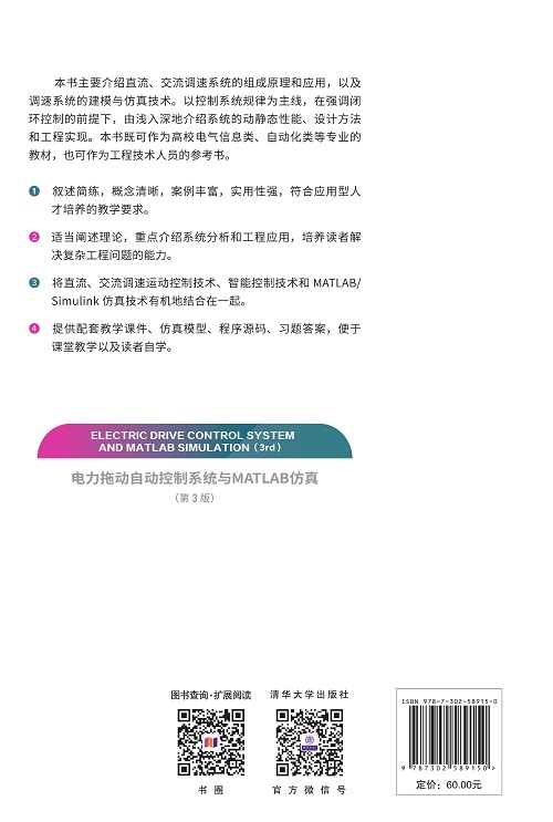 本书主要介绍直流和交流调速系统的组成原理和应用,以及调速系统的建模与仿真技术,在适当阐述理论的基础上,重点介绍系统的分析和工程应用,以提高读者处理实际问题的能力。书中遵循理论和实际相结合的原则,以系统控制规律为主线,在强调闭环控制的前提下,由浅入深地介绍了系统的动、静态性能和设计方法及系统的工程实现。还介绍了MATLAB及其图形仿真界面Simulink的应用基础知识、Simulink模型库的电机模块的功能和使用,并通过实例介绍了交直流调速系统的仿真方法和技巧。 本书适合作为电气工程及其自动化专业、自动化专业和其他以培养应用型人才为目的的相近专业的教材和教学参考书,也可供有关领域的工程技术人员参考。