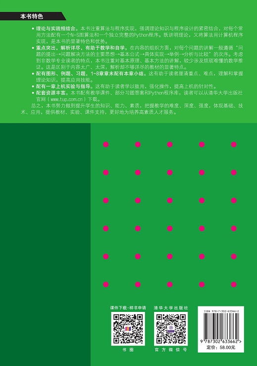 本书是作者十多年计算方法研究应用和教学经验的结晶。全书共9章,主要内容包括误差与算法、非线性方程求根、线性方程组直接求解和迭代求解、插值法、数值积分、矩阵特征值与特征向量的计算、常微分方程初值问题的数值解法等。 本书强调理论知识与程序设计的紧密结合,对每个常用方法配有一个NS图算法和一个独立完整的Python程序。书中配有大量图形,侧重从几何含义的角度直观地说明问题。 本书可作为理工科非数学专业的本科生、专科生的教材或教学参考书,也可作为对本课程感兴趣的科技人员的自学用书。