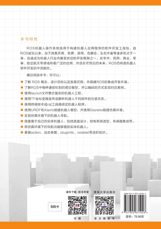 本书针对ROS机器人操作系统的初学者,以理论与实践相结合的设计思想为主线,循序渐进地介绍机器人操作系统,以帮助有志于机器人开发的读者方便快捷地上手ROS。主要内容包括ROS机器人操作系统的基础知识、通信机制、运行管理、机器人系统仿真、实体机器人设计、机器人导航,以及ROS进阶等内容。读者学习完本书后,能够入门ROS机器人操作系统,掌握机器人的相关理论知识、构建属于自己的机器人平台并实现机器人自主导航功能,为基于ROS机器人操作系统的产品开发奠定基础。 本书理论结合实践、深入浅出,适用于各类学校的ROS机器人操作系统课程。