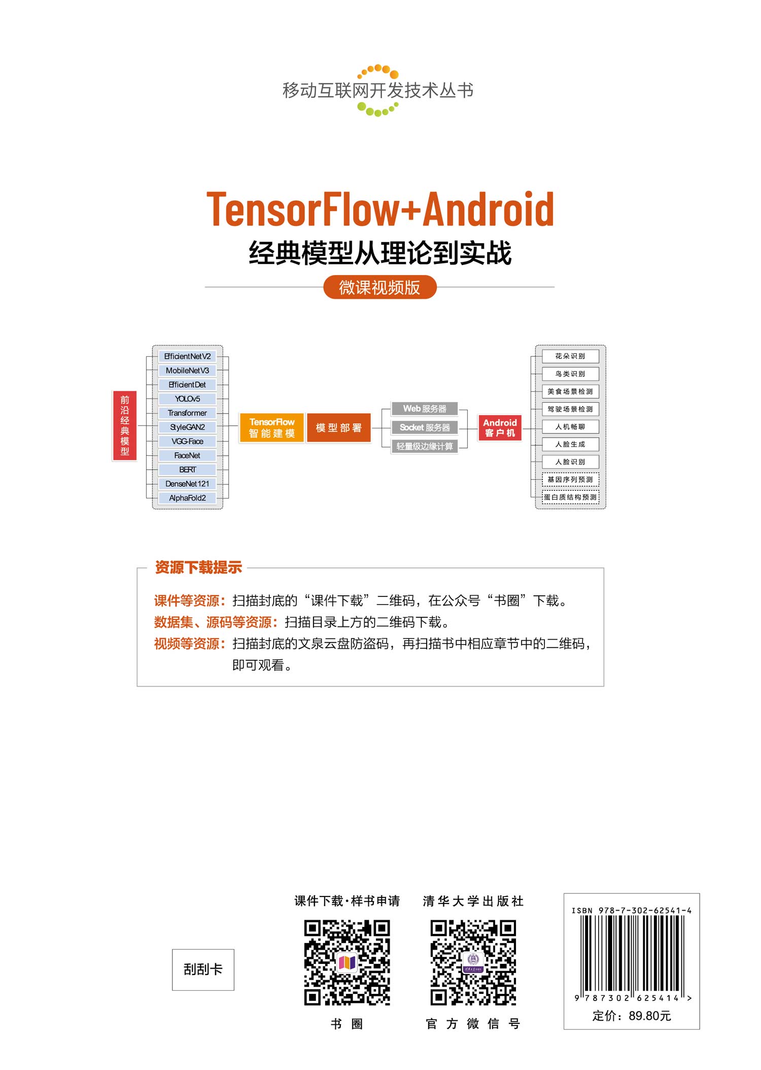 前言 这是一本以项目为引领、以经典模型为主线的面向产业链的实战化教科书。从建模到应用、从理论到实践,TensorFlow与Android贯穿始终。聚焦前沿,贴近生产,产教融合,注重实战。 全书技术演进路线如图0.1所示。模型挂帅,场景领航。学以致用,一以贯之。运用之妙,存乎一心。理论实战,一气呵成。 Web服务器模式、Socket服务器模式、轻量级边缘计算模式三条模型部署路径无缝集成,相互补充、相互支持。服务器模式可实现一对多的大规模并发应用。边缘计算模式的优点是不依赖远程网络和中央计算。 本书建模采用TensorFlow框架,Web服务器和Socket服务器采用Python语言编程,Android开发采用Kotlin语言编程。 图0.1全书技术演进路线 全书共九章,包括九个实战项目,涉及图像分类、目标检测、语言智能、人脸识别、图像生成、生物信息六个主题领域。第8章和第9章的生物信息项目计算量较大,模型推理周期较长,不适合Android即时部署演示。其他七个项目全部实现了从TensorFlow建模起步到Android场景部署的教学示范和应用示范。 本书所有章节都配备同步高清教学视频,读者可跟随教材同步复现项目设计的全部流程。纸质教材是教学视频的经纬根基,教学视频则是对纸质教材的立体超越。微课视频版教材的优势是纸质教材纲举目张,教学视频见微知著,二者相辅相成,实现1+1>2的教学效果。读者可扫描封底“文泉云盘”刮刮卡二维码,获得权限,再扫描对应章节处二维码,即可观看视频。本书涉及的数据集、源码、模...
