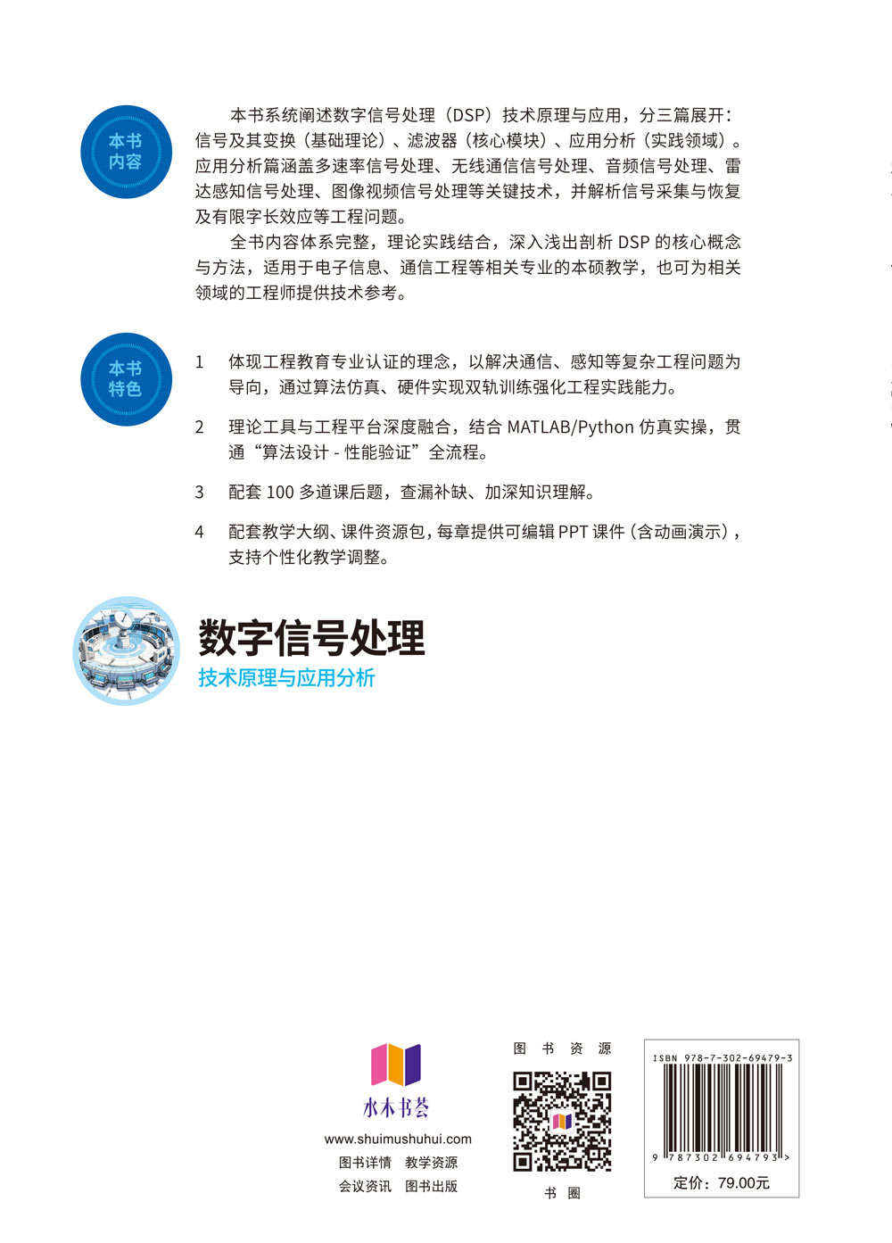 "本书全面地、系统地介绍数字信号处理(DSP)的基本理论、基本技术和应用分析,并根据作者多年从事数字信号处理的教学科研的心得体会列举了大量实例,以供读者参考。全书分为三部分,主要包括信号及其变换、滤波器以及应用分析。三个部分循序渐进地引导读者深入理解 DSP的核心概念和技术。在每章的结尾都附有必要的思考题,以供教学或自学练习,以便加深对所述内容的理解。 本书内容全面,结构清晰,理论与实践相结合,深入浅出地讲解了 DSP 的核心概念、技术方法和应用场景,适合作为电子信息工程、通信工程、控制工程等相关专业的本科生、研究 生教材,也可供从事DSP相关工作的工程技术人员参考。"