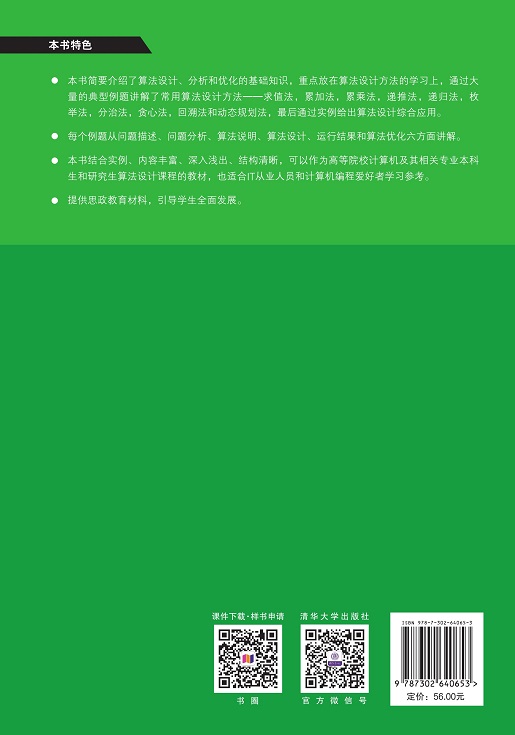 (1)系统性。本书在对算法概述的基础上,系统地讲解了常用算法设计方法:求值法,累加法,累乘法,递推法,递归法,枚举法,分治法,贪心法,回溯法和动态规划法,并对算法设计的数学模型、技巧和优化做了讲解。