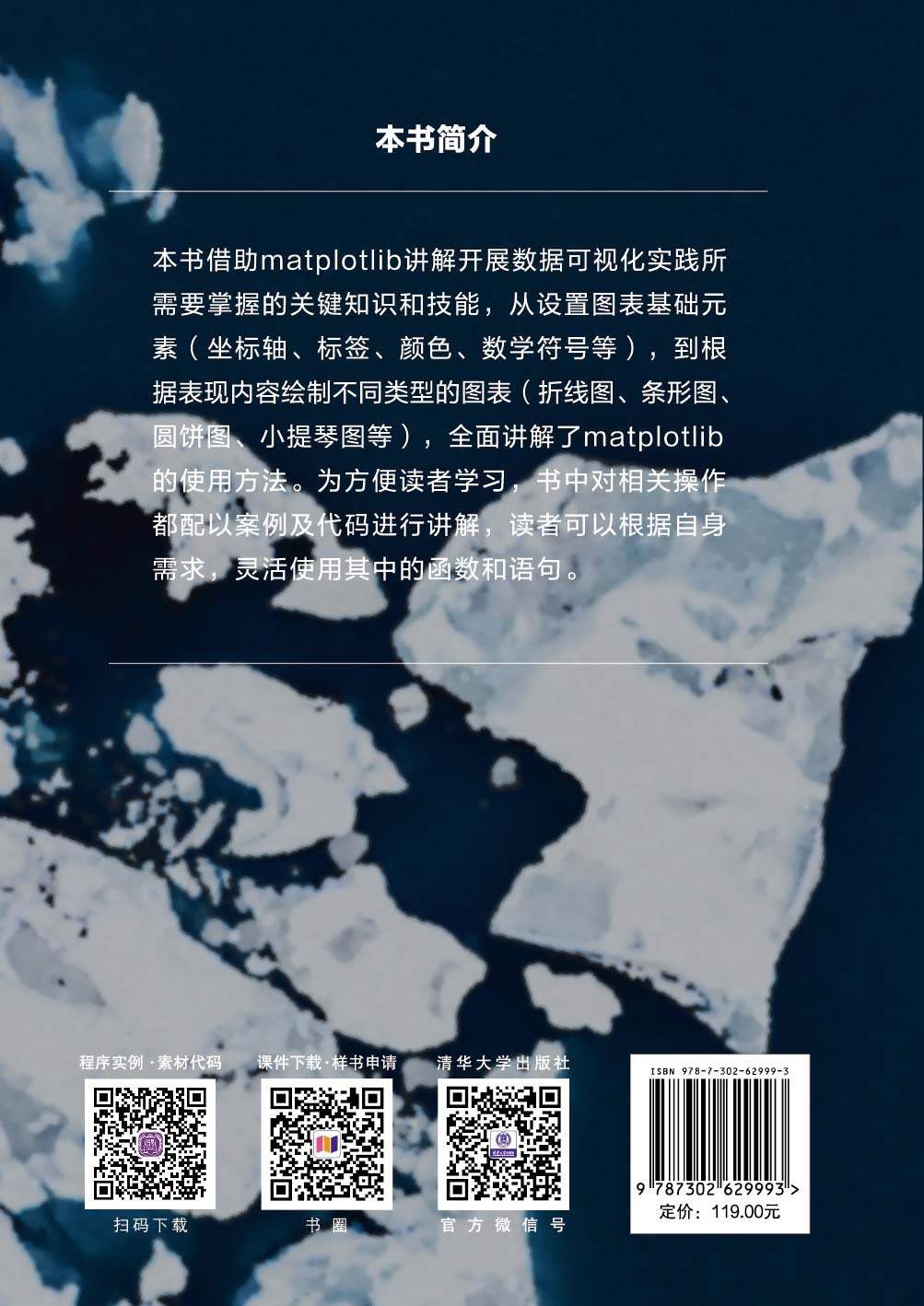 前言 人工智能的兴起,除了机器学习与深度学习带领风潮,从2D到3D的数据可视化也成为人工智能工程师钻研的主题。笔者多次与教育界的朋友聊天,一致感觉目前国内缺乏这方面完整叙述的书籍,这也是笔者撰写本书的动力。 本书包含32个主题,500多个程序实例,整本书内容如下: 完整解说操作matplotlib需要的NumPy知识 认识坐标轴与图表内容设计 绘制多个图表 图表的注释 彻底认识图表数学符号 折线图与堆叠折线图 散点图 色彩映射图 色彩条 建立数据图表 长条图与横条图 直方图 圆饼图 箱线图 极坐标绘图 阶梯图 棉棒图 影像金字塔 间断长条图 小提琴图 误差条 轮廓图 箭头图 几何图形绘制 表格制作 基础3D绘图 3D曲面设计 3D长条图 设计动画 笔者写过许多的计算机著作,本书沿袭笔者著作的特色,程序实例丰富,相信读者只要遵循本书内容,必定可以快速精通使用Python + matplotlib完成数据可视化。笔者编著本书虽力求完美,但是书中谬误难免,尚请读者不吝指正。 本书附录及程序实例代码文件可扫描下方二维码下载。 洪锦魁