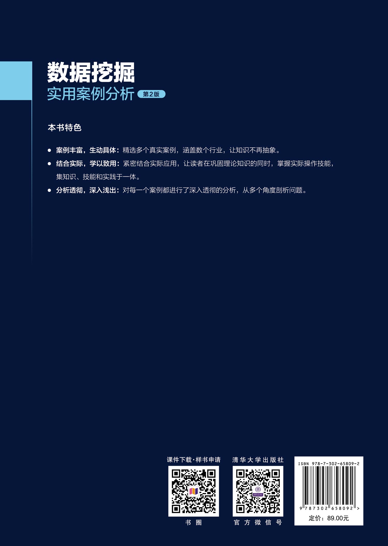 本书评为国家级实验教学示范中心联席会计算机学科组“十四五”规划教材,全书内容深入浅出,案例生动形象,原创性强,可以作为高校相关专业数据挖掘、机器学习等课程的实验和实训教材,也可以供学习数据分析的社会人士参考。