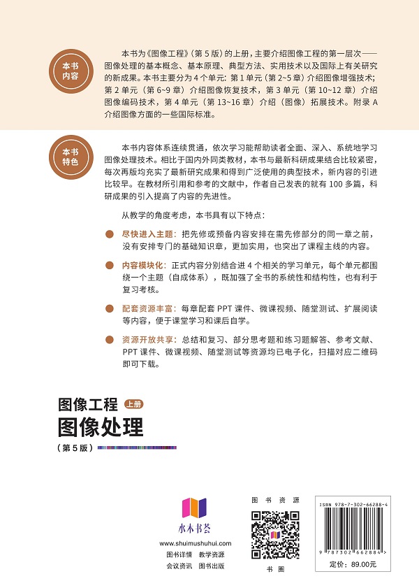 "本书内容体系连续贯通,依次学习能帮助读者全面、深入、系统地学习图像处理技术。相比于国内外同类教材,本书与**科研成果结合比较紧密,每次再版均充实了**研究成果和得到广泛使用的典型技术,新内容的引进比较早。在教材所引用和参考的文献中,作者自己发表的就有100多篇,科研成果的引入提高了内容的先进性。