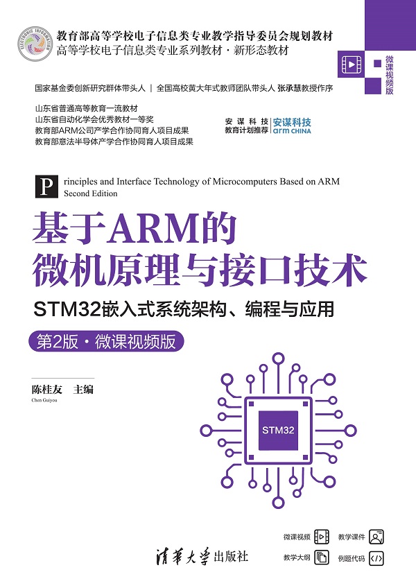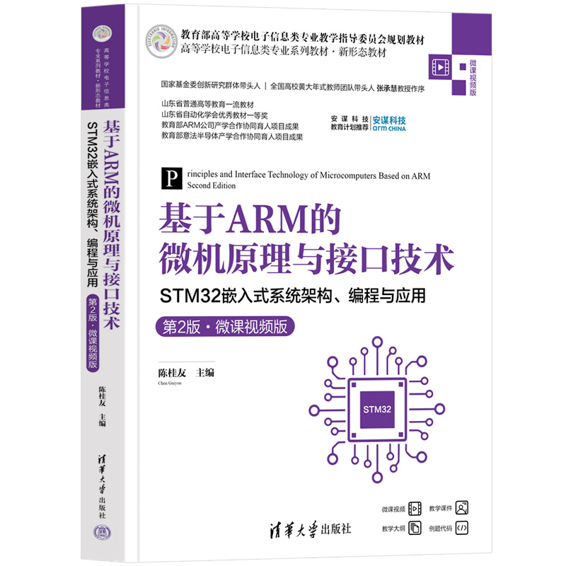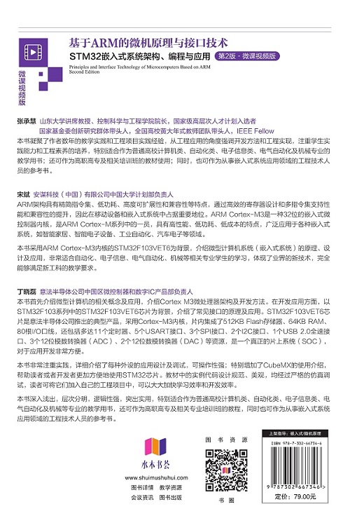 《基于ARM的微机原理与接口技术——STM32嵌入式系统架构、编程与应用(第2版·微课视频版)》基于作者长期讲授“微机原理与接口技术”课程和从事嵌入式系统应用开发的背景,首先介绍微型计算机的相关概念及应用,介绍Cortex M3微处理器架构及开发方法。在开发应用方面,以STM32F103系列中的STM32F103VET6芯片为背景,介绍了常见接口的原理及应用。STM32F103VET6芯片是意法半导体公司推出的典型产品,采用Cortex-M3内核,片内集成了512KB Flash存储器、64KB RAM、80根I/O口线,还包括多达11个定时器、5个USART接口、3个SPI接口、2个I2C接口、1个USB 2.0全速接口、3个12位模数转换器(ADC)、2个12位数模转换器(DAC)等资源,是一个真正的片上系统(SOC),对于应用开发非常方便