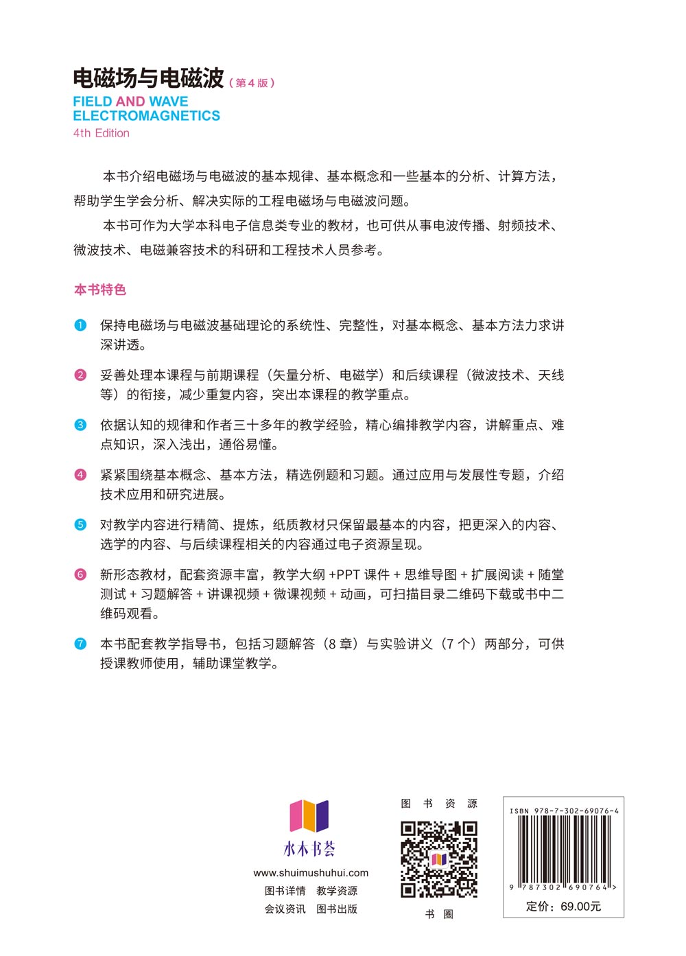 "本书介绍电磁场与电磁波的基本规律、基本概念和一些基本的分析、计算方法,帮助学生学 会分析、解决一些实际的工程电磁场与电磁波问题。本书保持了电磁场与电磁波基础理论的系统性、完整性,对基本概念、基本方法力求讲深讲透。妥善处理好“电磁场与电磁波”与前期课程(“矢量分析”“电磁学”)和后续课程(“微波技术”“天线”等)的衔接,减少重复内容,突出本课程的教学重点。依据认知的规律和作者三十多年的教学经验,在教学内容的编排,重点、难点讲解的方法上下了很大功夫,使教学内容深入浅出,有利于培养学生的自学能力。紧紧围绕基本概念、基本方法精选例题、习题。 本书为新形态教材,实现了纸质教材与数字资源的有效融合。通过扫描二维码,可观看全部讲课视频,可完成每章的自我检测,可查看每章的思维导图,可阅读很多应用案例,使学生能够将所学的理论与实际结合起来。 本书可作为大学本科电子信息工程、通信工程等专业的教材,也可供从事电波传播、射频技术、微波技术、电磁兼容技术的科研和工程技术人员参考。" "(1) 保持电磁场与电磁波基础理论的系统性、完整性,对基本概念、基本方法力求讲深讲透。 (2) 妥善处理本课程与前期课程(矢量分析、电磁学)和后续课程(微波技术、天线等)的衔接,减少重复内容,突出本课程的教学重点。 (3) 依据认知的规律和作者三十多年的教学经验,精心编排教学内容,讲解重点、难点知识,深入浅出,通俗易懂。 (4) 紧紧围绕基本概念、基本方法,精选例题和习题。通过应用与发展性专题,介绍技术应用和研究进展。 (5) 对教学内容进行精简、提炼,纸质教材只保留最基本的内容,把更深入的内容、选学的内容、与后续课程相关的内容通过电子资源呈现。 (6) 新形态教材,配套资源丰富,教学大纲+PPT课件+思维导图+扩展阅读+随堂测试+习题解答+讲课视频+微课视频+动画,可扫描目录二维码下载或书中二维码观看。 (7) 本书配套教学指导书,包括习题解答(8章)与实验讲义(7个)两部分,可供授课教师使用,辅助课堂教学。"