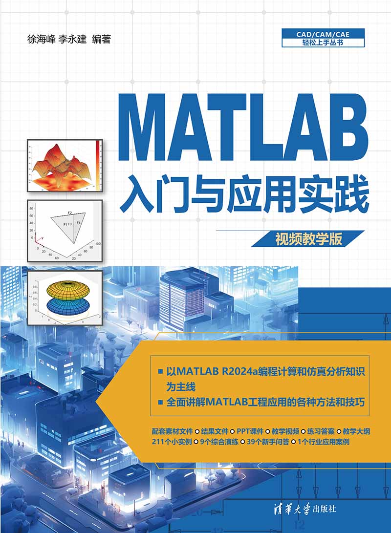 "《MATLAB入门与应用实践:视频教学版》基于MATLAB R2024a编写,以MATLAB编程计算和仿真分析知识为主线,全面讲解MATLAB工程应用的各种方法和技巧,配套素材文件、结果文件、PPT课件、教学视频、练习答案和教学大纲。 《MATLAB入门与应用实践:视频教学版》共分12章,通过211个小实例、9个综合案例、39个新手问答以及1个综合案例,全面讲解MATLAB软件的基础知识和应用案例,内容包括MATLAB入门、MATLAB基础、程序设计基础、图形绘制、图形与图像的处理、高等数学计算、方程组、符号运算、图形用户界面设计、Simulink仿真基础、数理统计分析、控制系统的时域分析设计实例等。本书通过实例介绍MATLAB配置参数的含义,内容安排由浅入深,步骤详细,便于用户掌握相关参数的设置方法。 《MATLAB入门与应用实践:视频教学版》适合MATLAB初学者、数值分析与数值计算人员、工程设计人员、数据分析人员阅读,也可以作为高等院校或者高职高专院校相关课程的教材。"