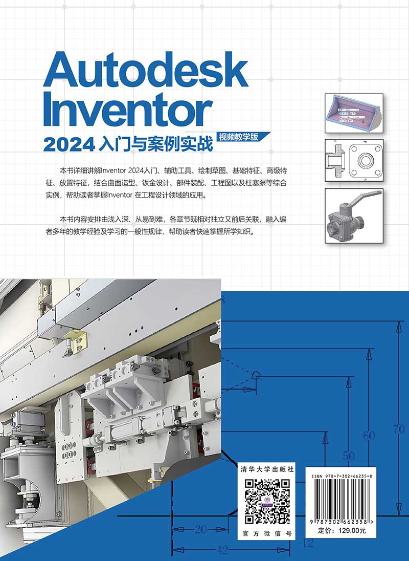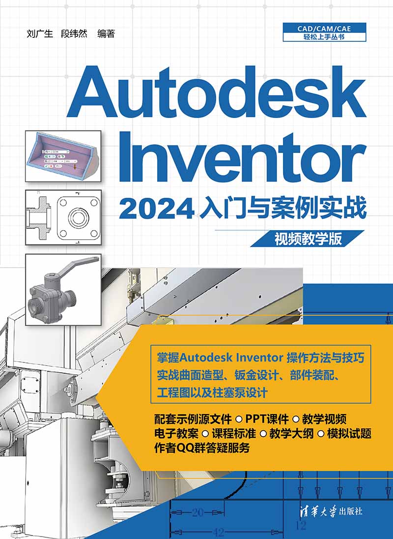 《Autodesk Inventor 2024入门与案例实战:视频教学版》以Autodesk Inventor 2024为平台,重点介绍Autodesk Inventor 2024中文版的各种操作方法及其在工程设计领域的应用。《Autodesk Inventor 2024入门与案例实战:视频教学版》配套示例源文件、PPT课件、教学视频、电子教案、课程标准、教学大纲、模拟试题、作者QQ群答疑服务。 全书共分11章,内容包括Inventor 2024入门、辅助工具、绘制草图、基础特征、高级特征、放置特征、曲面造型、钣金设计、部件装配、工程图以及柱塞泵综合实例。在介绍的过程中,内容由浅入深、从易到难,各章节既相对独立又相互关联。编者根据自己多年的教学和设计经验,及时给出总结和相关提示,以帮助读者快速掌握所学知识。 《Autodesk Inventor 2024入门与案例实战:视频教学版》内容翔实、图文并茂、语言简洁、思路清晰、实例丰富,适合Inventor设计初学者、Inventor工程应用设计人员,也适合作为高等院校或高职高专相关专业的教学用书。