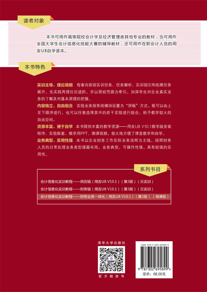 ?资源丰富,便于自学:本书提供丰富的教学资源--用友U8 V10.1教学版安装程序、实验账套、教学用PPT、微课视频,极大地方便了课堂教学和自学。