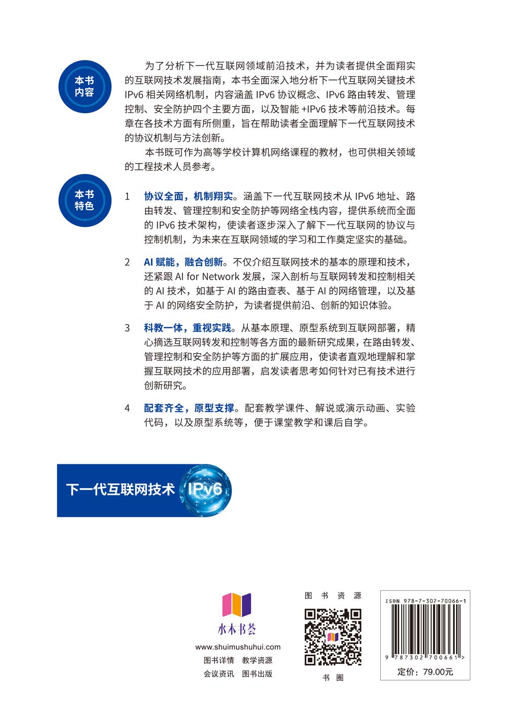 "(1)协议全面,机制翔实。涵盖下一代互联网技术从IPv6地址、路由转发、管理控制和安全防护等网络全栈内容,提供系统而全面的IPv6技术架构,使读者逐步深入了解下一代互联网的协议与控制机制,为未来在互联网领域的学习和工作奠定坚实的基础。