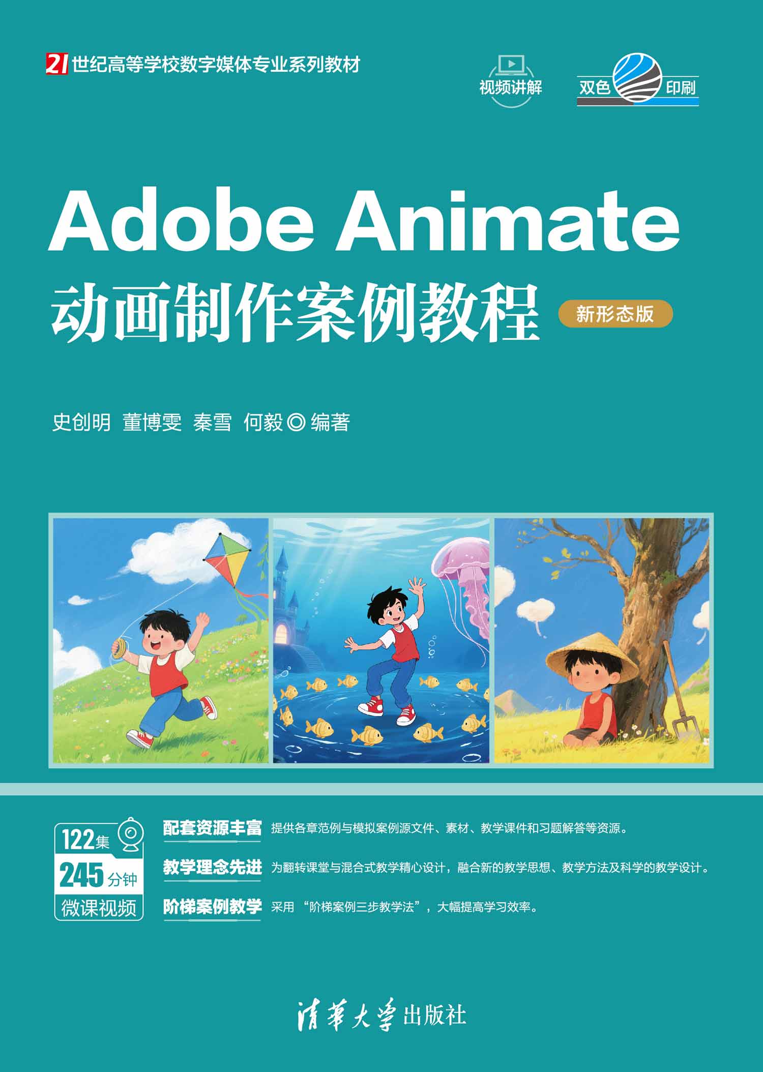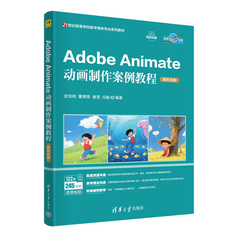 前言 本书是编者团队在多年教学科研的基础上不懈努力创作的结果。创作队伍中有教授、 讲师、研究生和本科生,不同人员分工和合作:教授负责整体教学思想的设计、教法的规 划、案例脚本的设计和审核、教学视频的设计和监制等工作;讲师和研究生负责案例的创 作和实现、教材文字的整理、教学视频的录制、题库的整理等工作;本科生作为助手做协 助工作,并且有大量的本科生进行了学习试用。 1. 本书特色 (1)配套资源丰富。 ■ 各章范例与模拟案例源文件、素材等资源:扫描下方“学习资源”二维码下载。 ■ 教学课件、习题解答等资源:扫描下方“教学资源”二维码下载,或者到清华大 学出版社官方网站本书页面下载。 ■ 微课视频(245 分钟,122 集):扫描书中相应章节的二维码在线学习。 学习资源 教学资源 注:请先扫描刮刮卡中的文泉云盘防盗码进行绑定后再获取相应资源。 (2) 为翻转课堂和混合式教学量身打造。整个教学过程的设计体现了新的理念、新的 教学方法以及科学的教学设计。 (3) 采用先进的教学理念“阶梯案例三步教学法”。通过实践证明“阶梯案例三步教 学法”可以大幅提高学习效率。 2. 学习软件版本的选择 建议使用较高版本的软件进行学习,高版本软件运行速度快,实现效果好。本书配套 资源的案例讲解和视频录制使用的软件版本是Adobe Animate 2024,建议读者使用该版本 进行学习。其他版本可能在软件界面和功能上有一些区别,但不影响对本书大部分内容的 学习。 3.“ 阶梯案例三步教学法”简介 ■ 第一步:范例学习。每章设计一到多个经典案例,进行手把...
