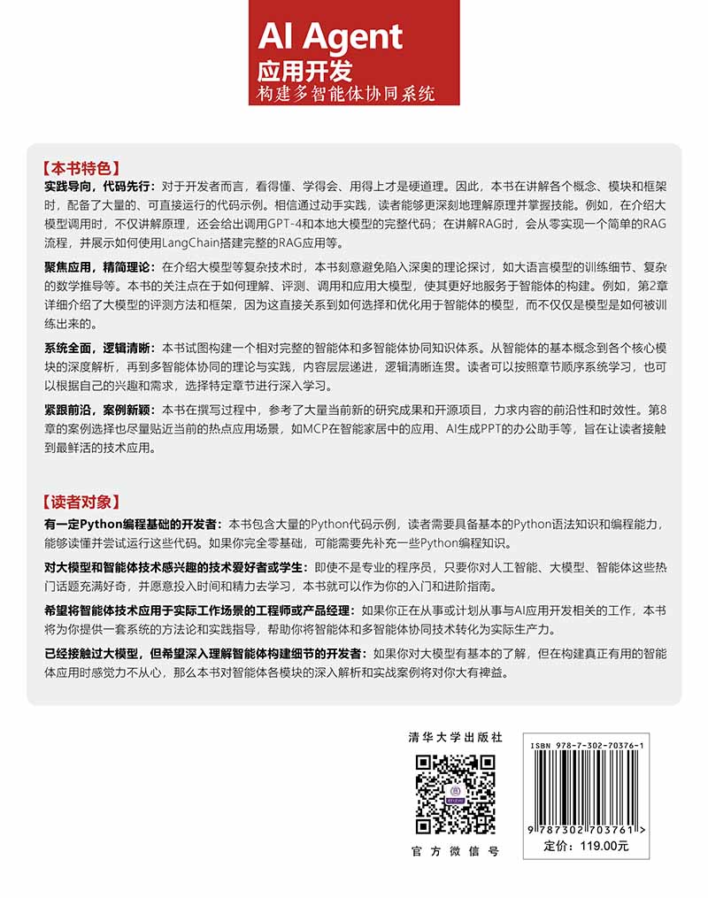 "《AI Agent应用开发:构建多智能体协同系统》深入浅出地介绍智能体与多智能体协同的核心知识及开发技巧。《AI Agent应用开发:构建多智能体协同系统》共8章,从智能体的基本概念、等级划分及模块组成入手,逐步深入探讨提示词工程、大模型评测与应用、记忆与RAG模块、规划能力等关键模块,并辅以编程实践。书中不仅详细讲解了多智能体相关理论与开源框架,更通过智能家居助手、AI办公助手、语言翻译助手、智能客服等领域的实战案例,展示多智能体系统解决复杂问题的强大能力。 《AI Agent应用开发:构建多智能体协同系统》特色鲜明,以代码示例为主,聚焦工程实践,避免冗余理论,直击智能体应用开发的核心。《AI Agent应用开发:构建多智能体协同系统》适合具有一定Python基础,了解或使用过大模型的开发者、工程师、产品经理以及对AI应用开发感兴趣的读者。"