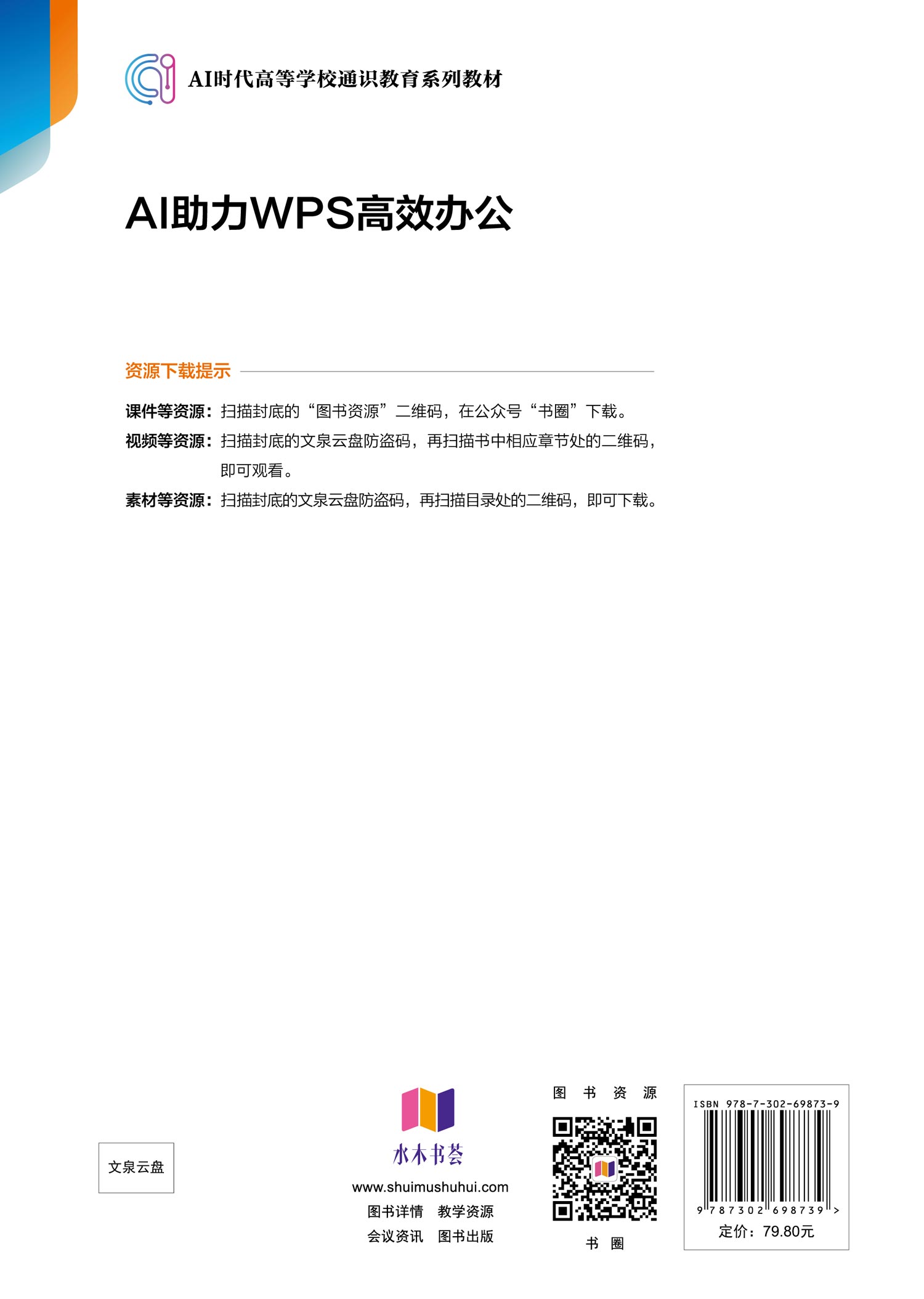 "本书专为办公人员及WPS软件使用者量身打造,采用“理论+ 案例实践+AI 应用”的 编写模式,旨在帮助读者在掌握WPS 办公软件基础操作和常用的办公技能的同时,通过AI技术的辅助,提升办公效率与质量。 本书内容丰富,实用性强,适合作为高等学校相关专业的教材,也适合广大办公人员、WPS 软件学习者及希望提升办公效率的人群阅读。无论是WPS的初学者,还是有一定基础的办公人员,都能通过本书的学习,掌握AI 与WPS 办公软件的结合应用,提升个人办公技能,实现高效办公。 "
