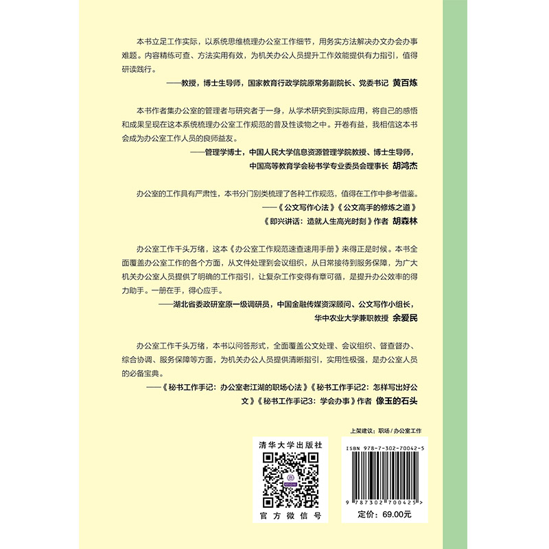 "本书采用主题设问方式,全面介绍了办公室工作人员在办文、办会、办事各个场景下的相关内容,包括理念认知、团队建设、公文格式、公文处理、文稿写作、信息工作、会议组织、沟通协调、公务接待、信访值班、机要保密、督查督办、服务保障、工作方法等14个方面,一共设置了300多个问题,便于读者在繁忙的工作之余快 速查找知识要点,具有较强的实操性。 本书可作为各类学校本科生、研究生选修教材,以及文秘专业、专题培训的辅助教材,也可以作为办公室和其他机关工作人员的学习参考书。"