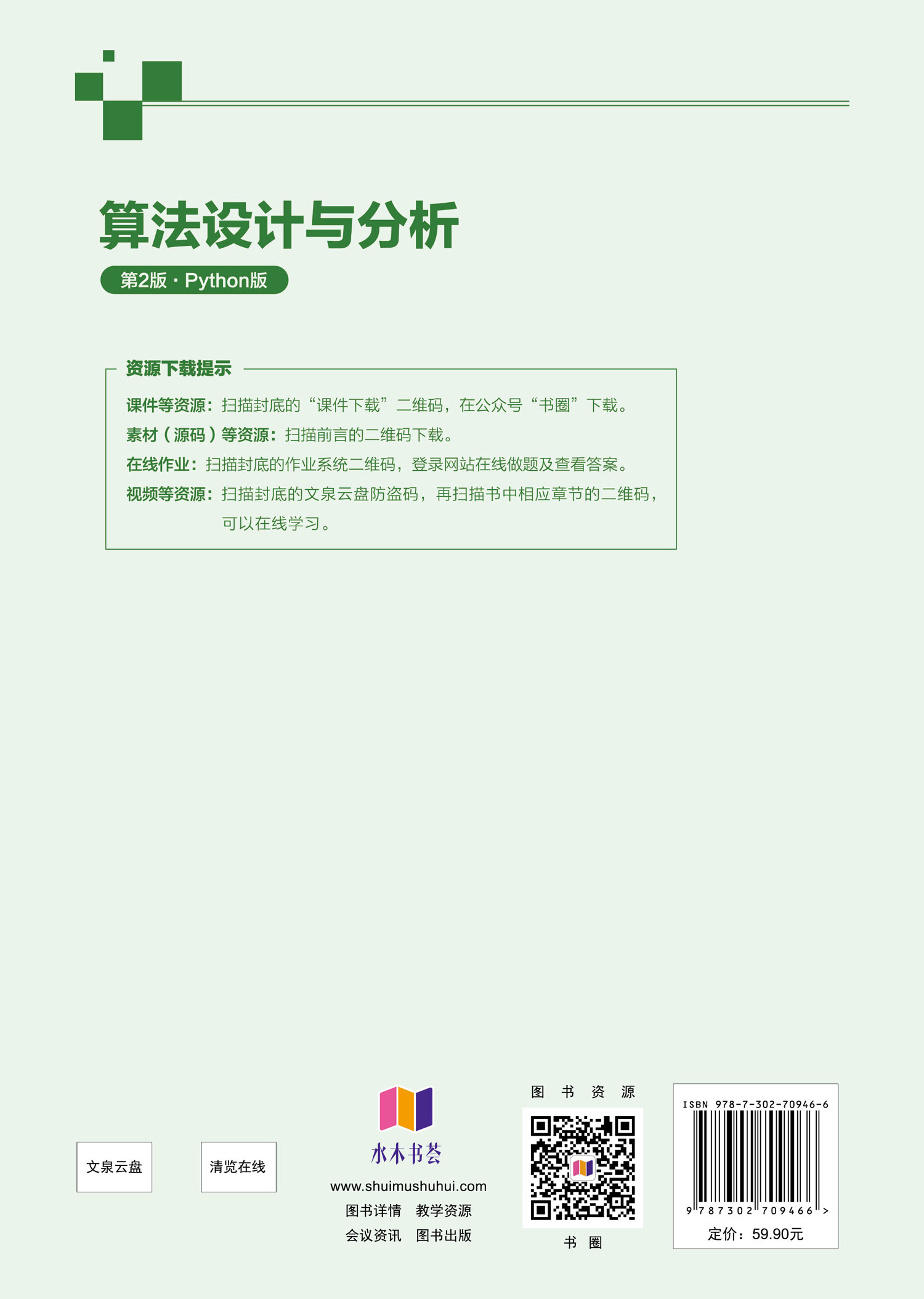 (4)网络资源丰富,便于教学、自学。网络资源包括本书所有 Python源代码、习题解析、微视频、微课件、随堂测试等丰富的学习资源。"